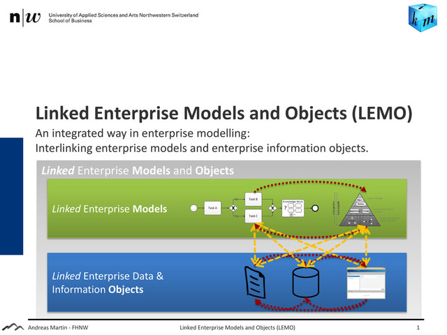are invited to create an enterprise architecture for the School of Business FHNW during research proposal phase. This gives a unique opportunity to put the enterprise architecture methodology into practice and have access to real world data. Apart from that, our experts in enterprise architecture (Knut Hinkelmann and others) will coach the students. Linked Enterprise Models and Objects (LEMO) 13