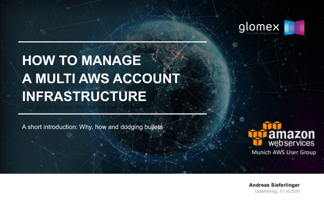 to use AWS Multi Account Setups https://aws.amazon.com/de/answers/account-management/aws-multi-account-security-strategy S3 configuration for use with 3 accounts http://docs.aws.amazon.com/AmazonS3/latest/dev/example-walkthroughs-managing-access-example4.html aws-mfa tool https://github.com/broamski/aws-mfa Security Monkey https://github.com/Netflix/security_monkey Slides https://speakerdeck.com/andreassieferlinger glomex techblog coming soon LINKS