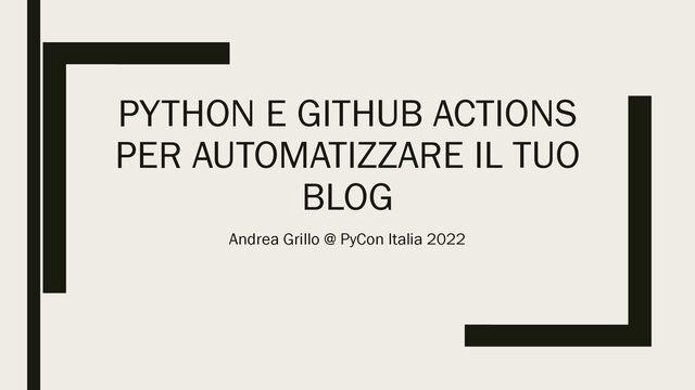 GitHub Actions è il potente strumento introdotto da GitHub per automatizzare le operazioni che riguardano una repository GitHub. Ogni volta che un evento viene generato dalla nostra repository (una commit, un issue, …), GitHub Actions fa partire in automatico una sequenza di operazioni definite dall’utente. Queste operazioni (dette “Actions”) possono essere condivise dalla community o sviluppate personalmente, anche in Python! In questo talk voglio mostrare come costruire la propria GitHub Action in Python per condividere automaticamente i post di un blog su GitHub Pages su altre piattaforme, come Medium.