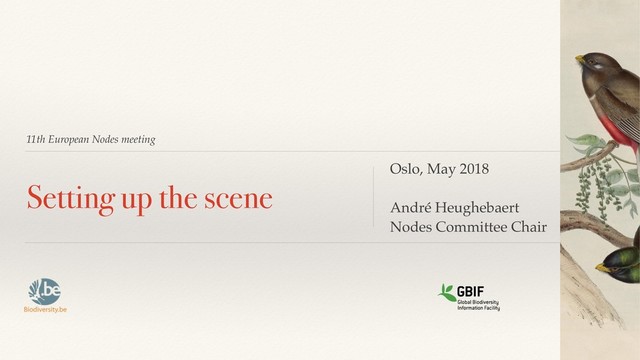 Group (NSG) consists of the chair and vice-chairs of the Participant Node Managers Committee joined by a regional representative from each of GBIF’s six regions. The NSG’s objectives are to formulate specific recommendations to relevant GBIF bodies based on feedback provided by Participant nodes, and to provide advice on GBIF’s annual work programmes as they relate to the efforts of GBIF nodes.
