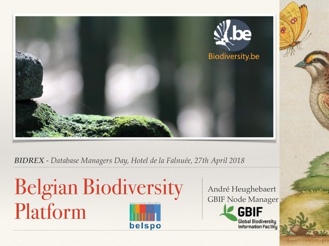 the Belgian BIF ❖ Offer ICT support: ❖ Darwin Core Mapping ❖ Dedicated Data Portals ❖ Data Management ❖ Data Cleaning ❖ Data Papers ❖ Training on DB, GIS, DwC & IPT