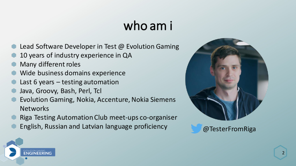 Evolution Gaming 10 years of industry experience in QA Many different roles Wide business domains experience Last 6 years – testing automation Java, Groovy, Bash, Perl, Tcl Evolution Gaming, Nokia, Accenture, Nokia Siemens Networks Riga Testing Automation Club meet-ups co-organiser English, Russian and Latvian language proficiency @TesterFromRiga