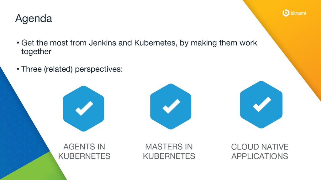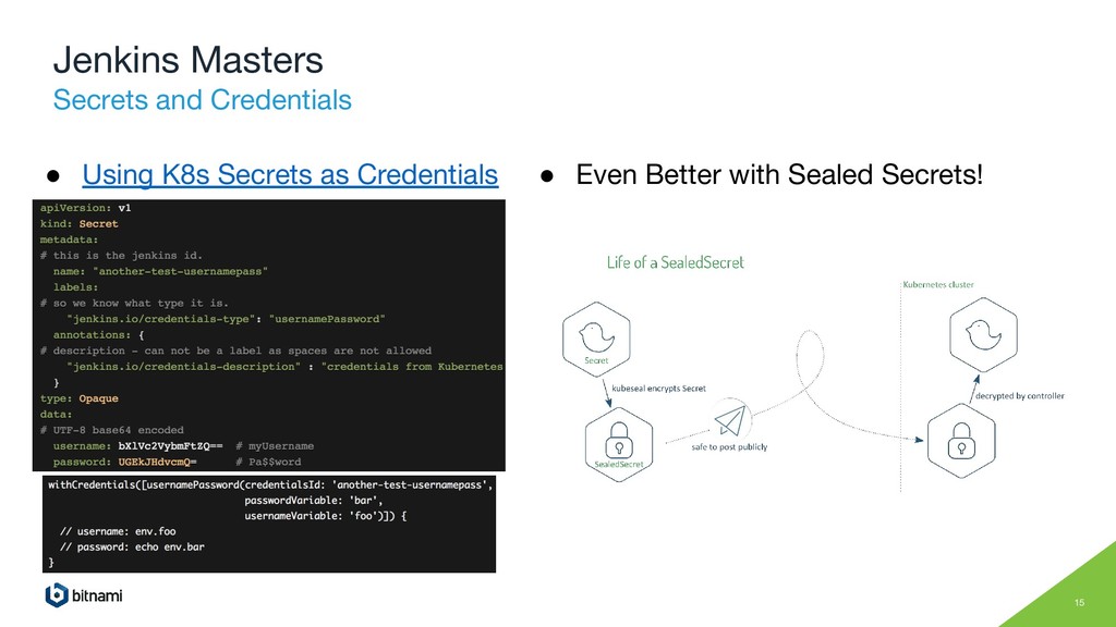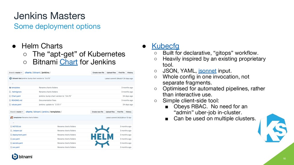 for declarative, “gitops” workflow. ◦ Heavily inspired by an existing proprietary tool. ◦ JSON, YAML, jsonnet input. ◦ Whole config in one invocation, not separate fragments. ◦ Optimised for automated pipelines, rather than interactive use. ◦ Simple client-side tool: ▪ Obeys RBAC. No need for an “admin” uber-job in-cluster. ▪ Can be used on multiple clusters. • Helm Charts ◦ The “apt-get” of Kubernetes ◦ Bitnami Chart for Jenkins