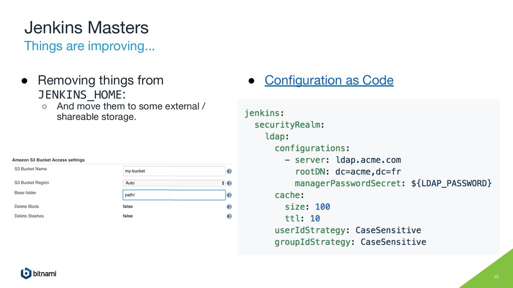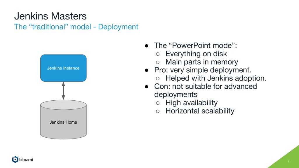 Jenkins Instance • The “PowerPoint mode”: ◦ Everything on disk ◦ Main parts in memory • Pro: very simple deployment. ◦ Helped with Jenkins adoption. • Con: not suitable for advanced deployments ◦ High availability ◦ Horizontal scalability