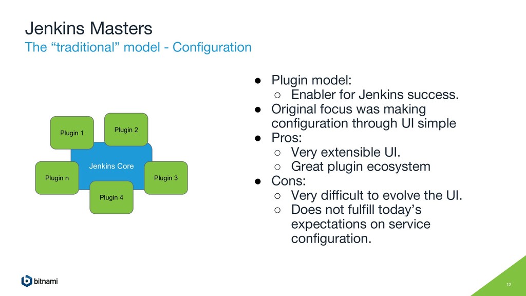 • Plugin model: ◦ Enabler for Jenkins success. • Original focus was making configuration through UI simple • Pros: ◦ Very extensible UI. ◦ Great plugin ecosystem • Cons: ◦ Very difficult to evolve the UI. ◦ Does not fulfill today’s expectations on service configuration. Plugin 1 Plugin 2 Plugin 3 Plugin 4 Plugin n
