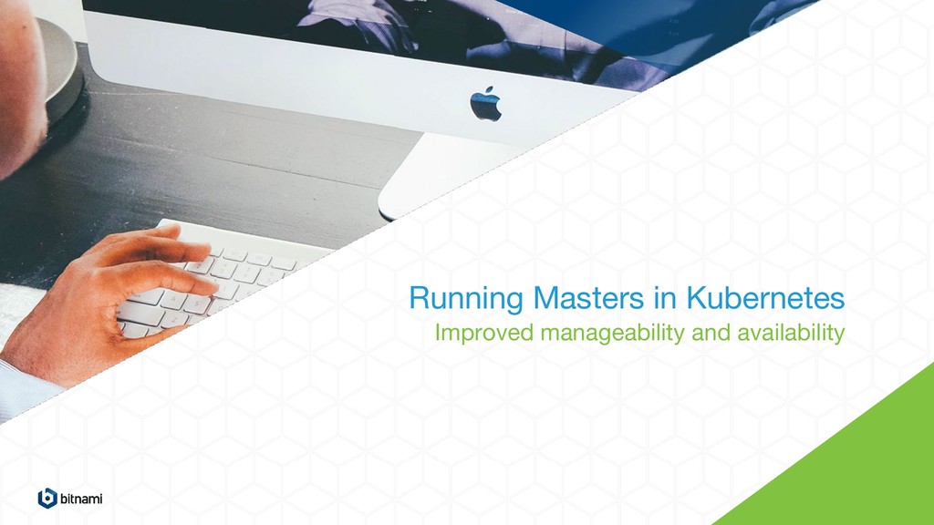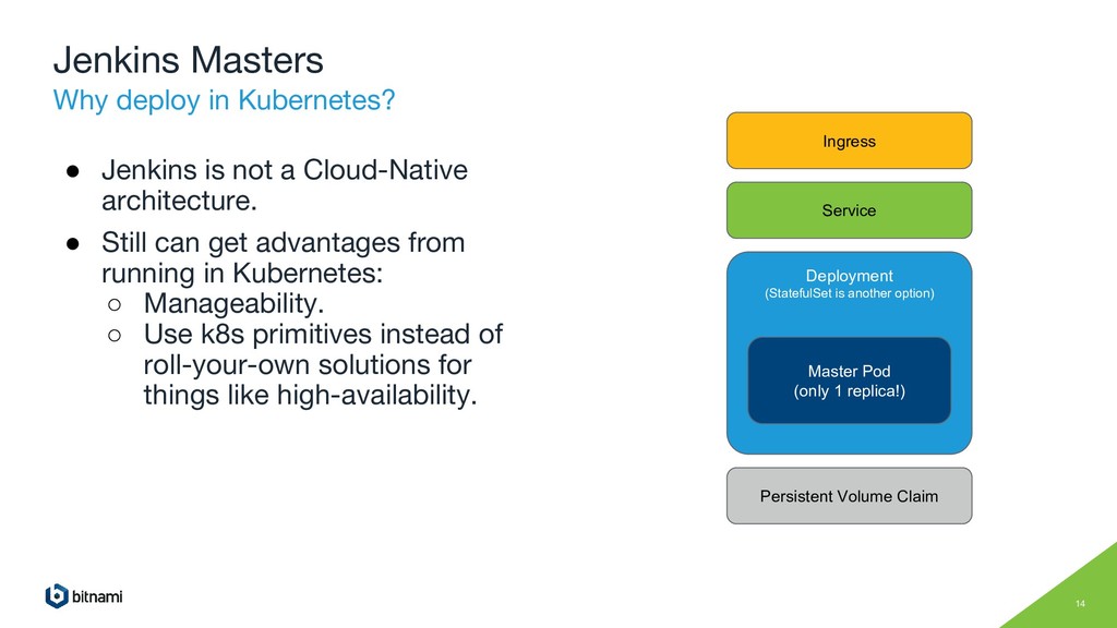 not a Cloud-Native architecture. • Still can get advantages from running in Kubernetes: ◦ Manageability. ◦ Use k8s primitives instead of roll-your-own solutions for things like high-availability. Persistent Volume Claim Deployment (StatefulSet is another option) Master Pod (only 1 replica!) Service Ingress