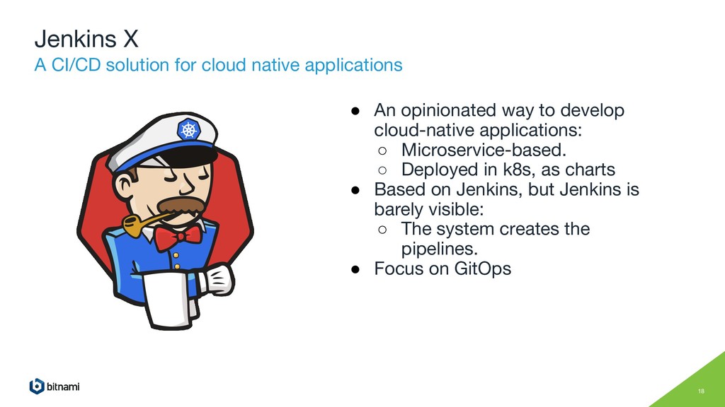 • An opinionated way to develop cloud-native applications: ◦ Microservice-based. ◦ Deployed in k8s, as charts • Based on Jenkins, but Jenkins is barely visible: ◦ The system creates the pipelines. • Focus on GitOps
