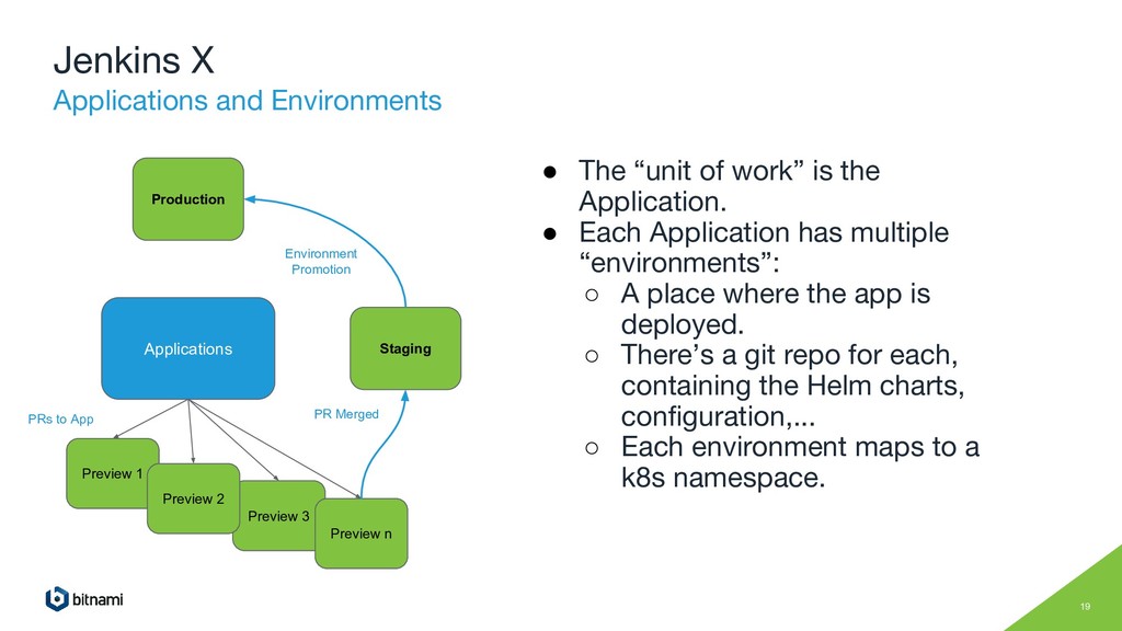 Preview 3 Preview 2 Preview n Staging PRs to App PR Merged Environment Promotion • The “unit of work” is the Application. • Each Application has multiple “environments”: ◦ A place where the app is deployed. ◦ There’s a git repo for each, containing the Helm charts, configuration,... ◦ Each environment maps to a k8s namespace.