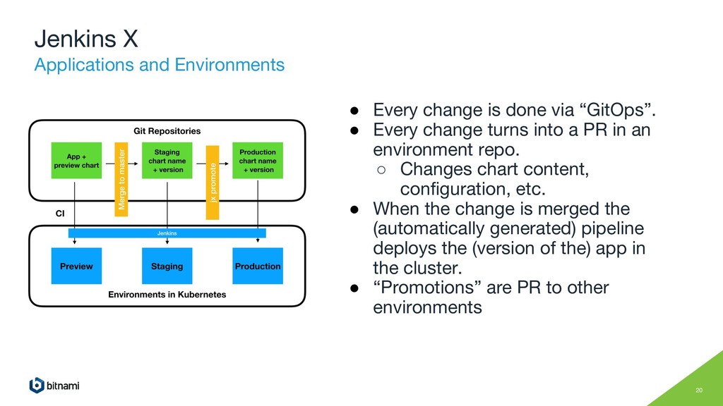 done via “GitOps”. • Every change turns into a PR in an environment repo. ◦ Changes chart content, configuration, etc. • When the change is merged the (automatically generated) pipeline deploys the (version of the) app in the cluster. • “Promotions” are PR to other environments