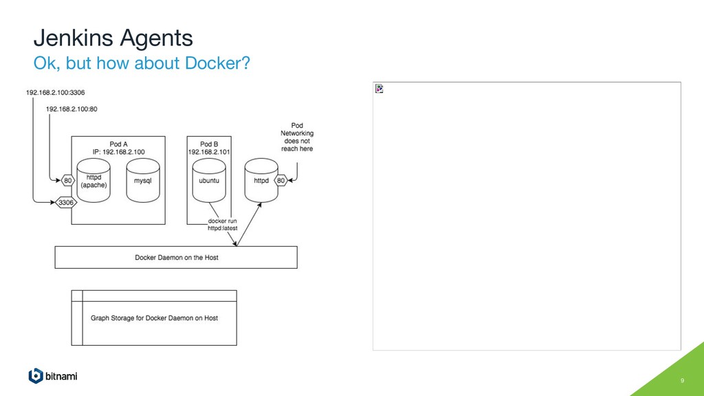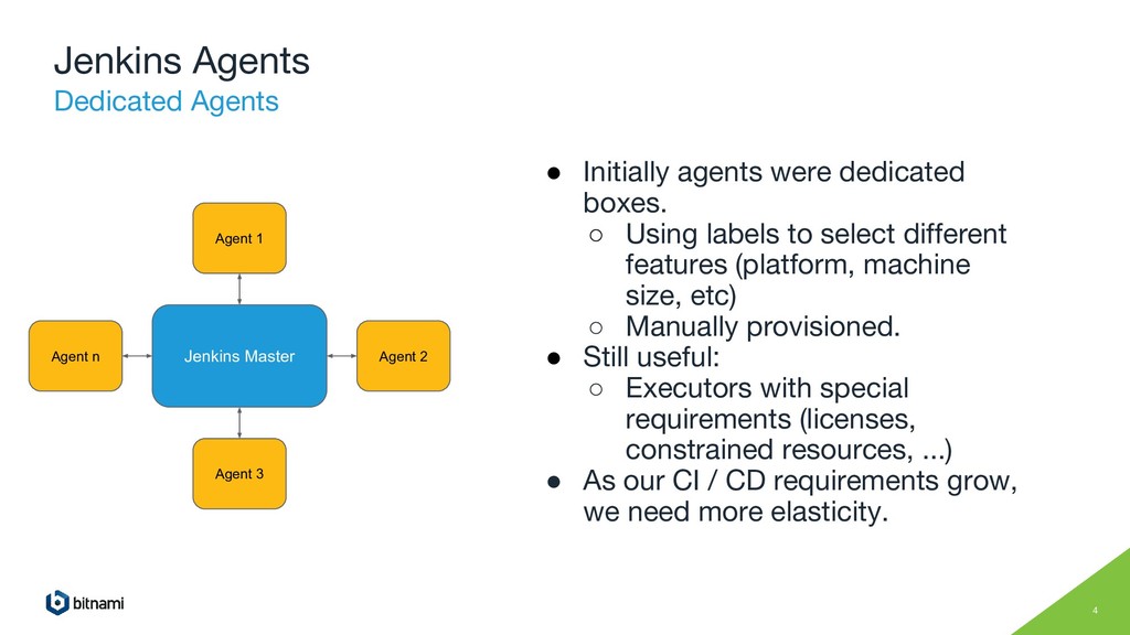 boxes. ◦ Using labels to select different features (platform, machine size, etc) ◦ Manually provisioned. • Still useful: ◦ Executors with special requirements (licenses, constrained resources, ...) • As our CI / CD requirements grow, we need more elasticity. Jenkins Master Agent 1 Agent 2 Agent 3 Agent n