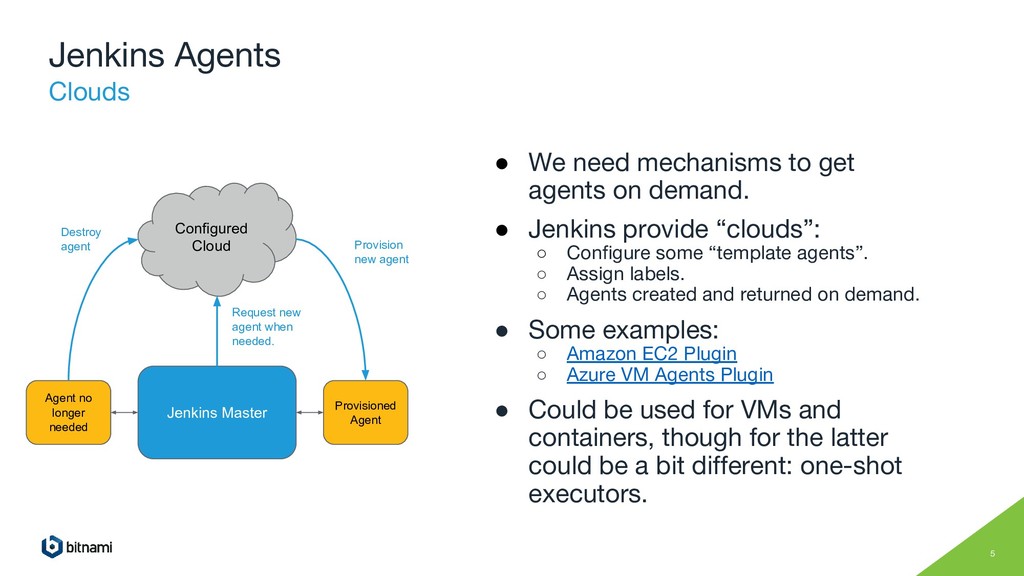 agents on demand. • Jenkins provide “clouds”: ◦ Configure some “template agents”. ◦ Assign labels. ◦ Agents created and returned on demand. • Some examples: ◦ Amazon EC2 Plugin ◦ Azure VM Agents Plugin • Could be used for VMs and containers, though for the latter could be a bit different: one-shot executors. Jenkins Master Provisioned Agent Agent no longer needed Configured Cloud Request new agent when needed. Provision new agent Destroy agent