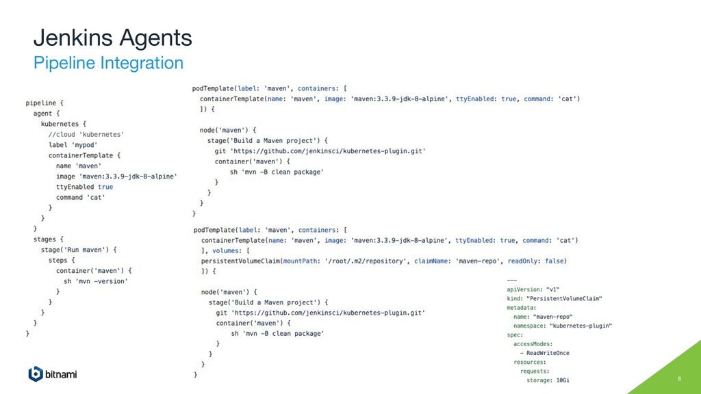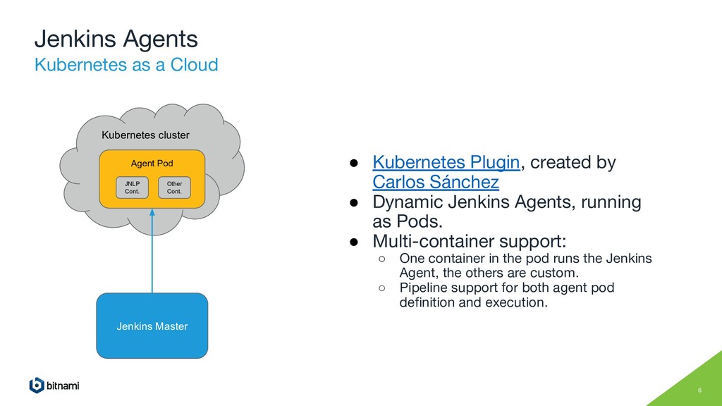 created by Carlos Sánchez • Dynamic Jenkins Agents, running as Pods. • Multi-container support: ◦ One container in the pod runs the Jenkins Agent, the others are custom. ◦ Pipeline support for both agent pod definition and execution. Jenkins Master Kubernetes cluster Agent Pod JNLP Cont. Other Cont.
