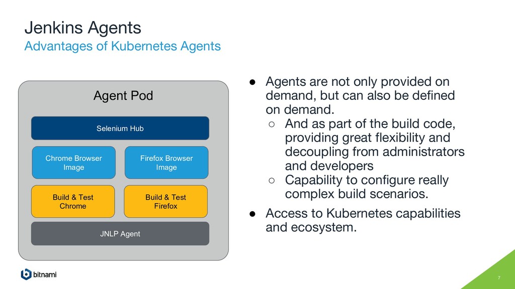 not only provided on demand, but can also be defined on demand. ◦ And as part of the build code, providing great flexibility and decoupling from administrators and developers ◦ Capability to configure really complex build scenarios. • Access to Kubernetes capabilities and ecosystem. Agent Pod JNLP Agent Build & Test Chrome Selenium Hub Build & Test Firefox Chrome Browser Image Firefox Browser Image