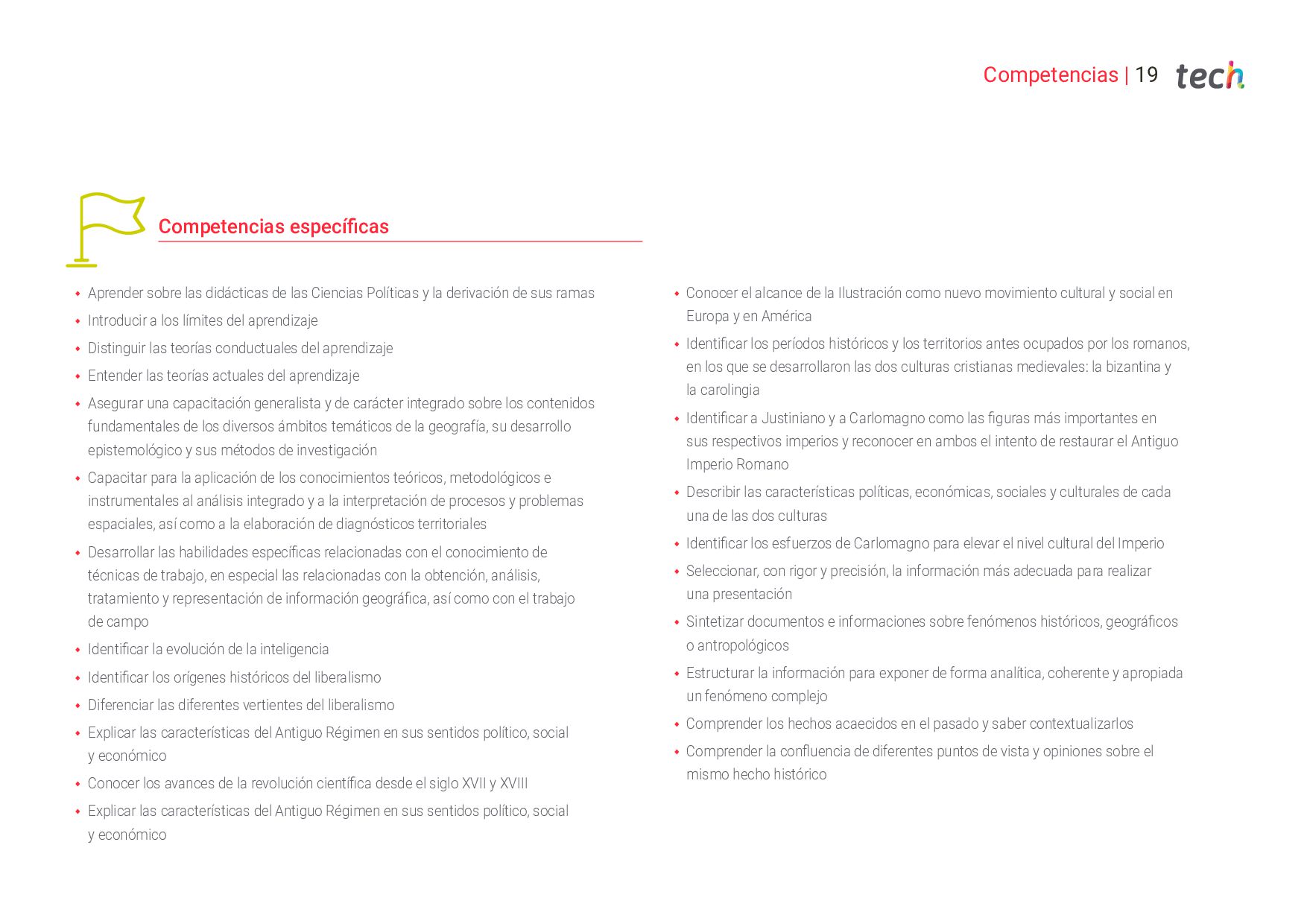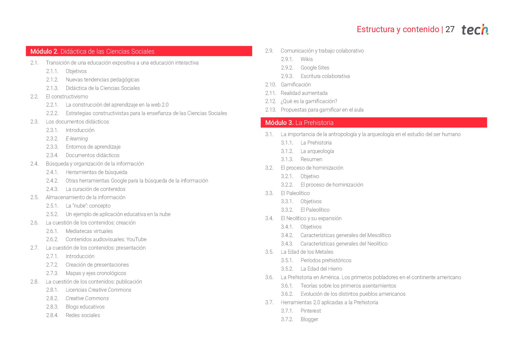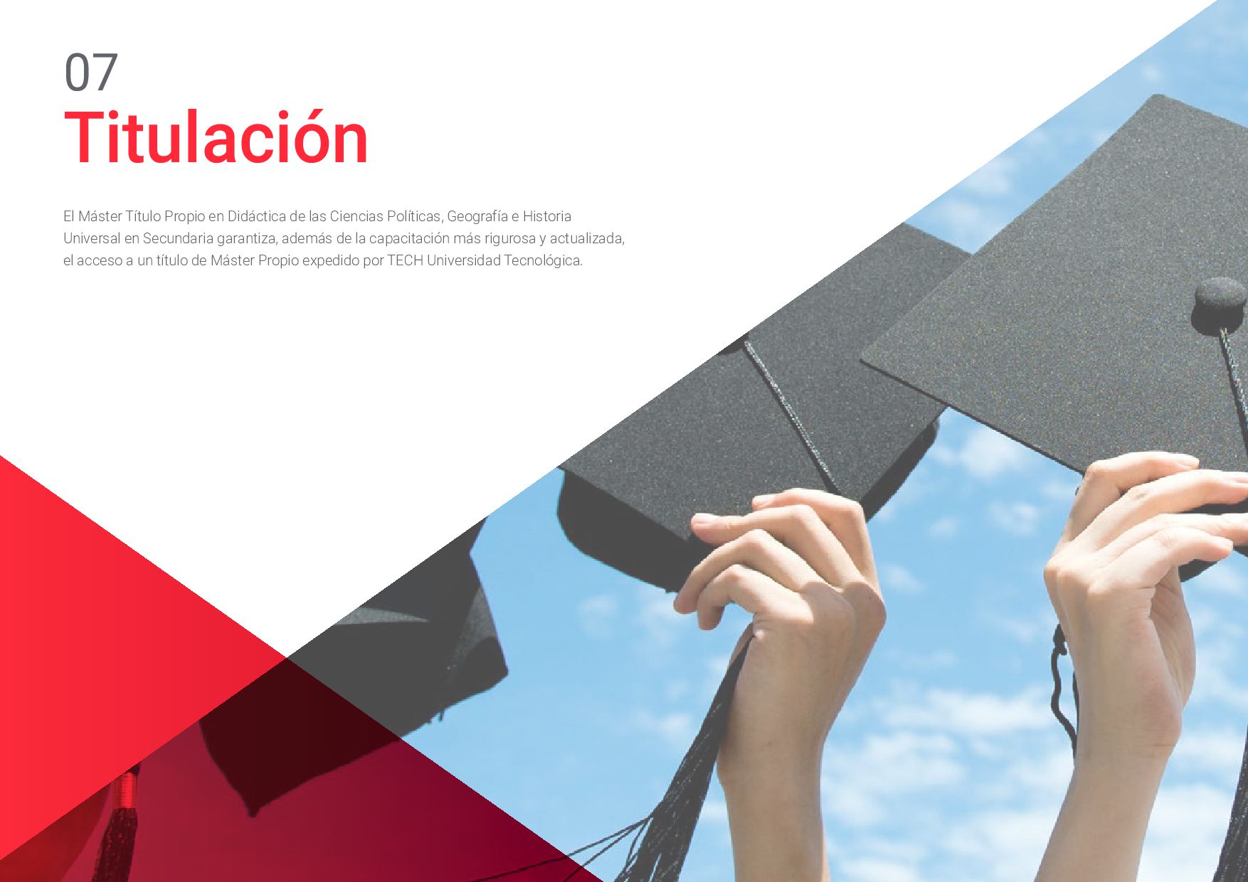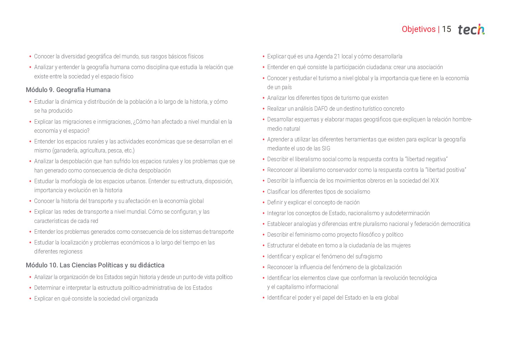 en la enseñanza de las Ciencias Humanas ha diseñado una hoja de ruta en la que se ha prestado especial cuidado en establecer una relación secuencial entre los contenidos que se presentan y su posterior relación con los recursos. El diseño, dirigido a profesores de Ciencias Sociales, se ha basado en la realidad favoreciendo un aprendizaje holístico y significativo. Se ha tenido especial y cuidado en la representación de entornos de aprendizaje motivadores encaminados a construir una actitud favorable ante los nuevos conocimientos. El ritmo, la dificultad y la complejidad de las metodologías avanzan con el programa y, con éste, el proceso evaluador que se centra en recopilar evidencias de aprendizaje al final de cada sección y de cada módulo. Una vez finalizado el programa, el docente habrá manejado un elenco de actividades, herramientas y contenidos lo suficientemente amplio que le capacitarán para guiar a sus alumnos en aquellas tareas que lo necesiten, sugerir otras que puedan realizar por sí mismos e, incluso, proponer un tercer grupo de tareas: las que se realizan con un carácter social y colaborativo. Una de las aportaciones más relevantes consiste en capacitar al docente para definir sus propios diseños instruccionales. Podrá extrapolar las técnicas y estrategias metodológicas utilizadas tales como: gestión de proyectos; elaboración de presentaciones, esquemas y mapas mentales; creación de documentos (infografías, mapas, audios, álbumes, tablones, ejes cronológicos, etc.); creación de blogs educativos y Wikis almacenando información en “la nube”, y mucho más que caracteriza la escuela del siglo XXI. Este Máster Título Propio en Didáctica de las Ciencias Políticas, Geografía e Historia Universal en Secundaria contiene el programa más completo y actualizado del mercado. Sus características más destacadas son: Desarrollo de más de 75 casos prácticos presentados por expertos en Didáctica de las Ciencias Políticas, Geografía e Historia Universal en Secundaria Sus contenidos gráficos, esquemáticos y eminentemente prácticos con los que están concebidos, recogen una información científica y práctica sobre aquellas disciplinas indispensables para el ejercicio profesional Novedades sobre el empleo de la Didáctica de las Ciencias Políticas, Geografía e Historia Universal en Secundaria Contiene ejercicios prácticos donde realizar el proceso de autoevaluación para mejorar el aprendizaje Sistema interactivo de aprendizaje basado en algoritmos para la toma de decisiones sobre las situaciones planteadas Con especial hincapié en metodologías basadas en la evidencia en Didáctica de las Ciencias Políticas, Geografía e Historia Universal en Secundaria Todo esto se complementará con lecciones teóricas, preguntas al experto, foros de discusión de temas controvertidos y trabajos de reflexión individual Disponibilidad de los contenidos desde cualquier dispositivo fijo o portátil con conexión a internet Actualiza tus conocimientos a través del programa en Didáctica de las Ciencias Políticas, Geografía e Historia Universal en Secundaria”