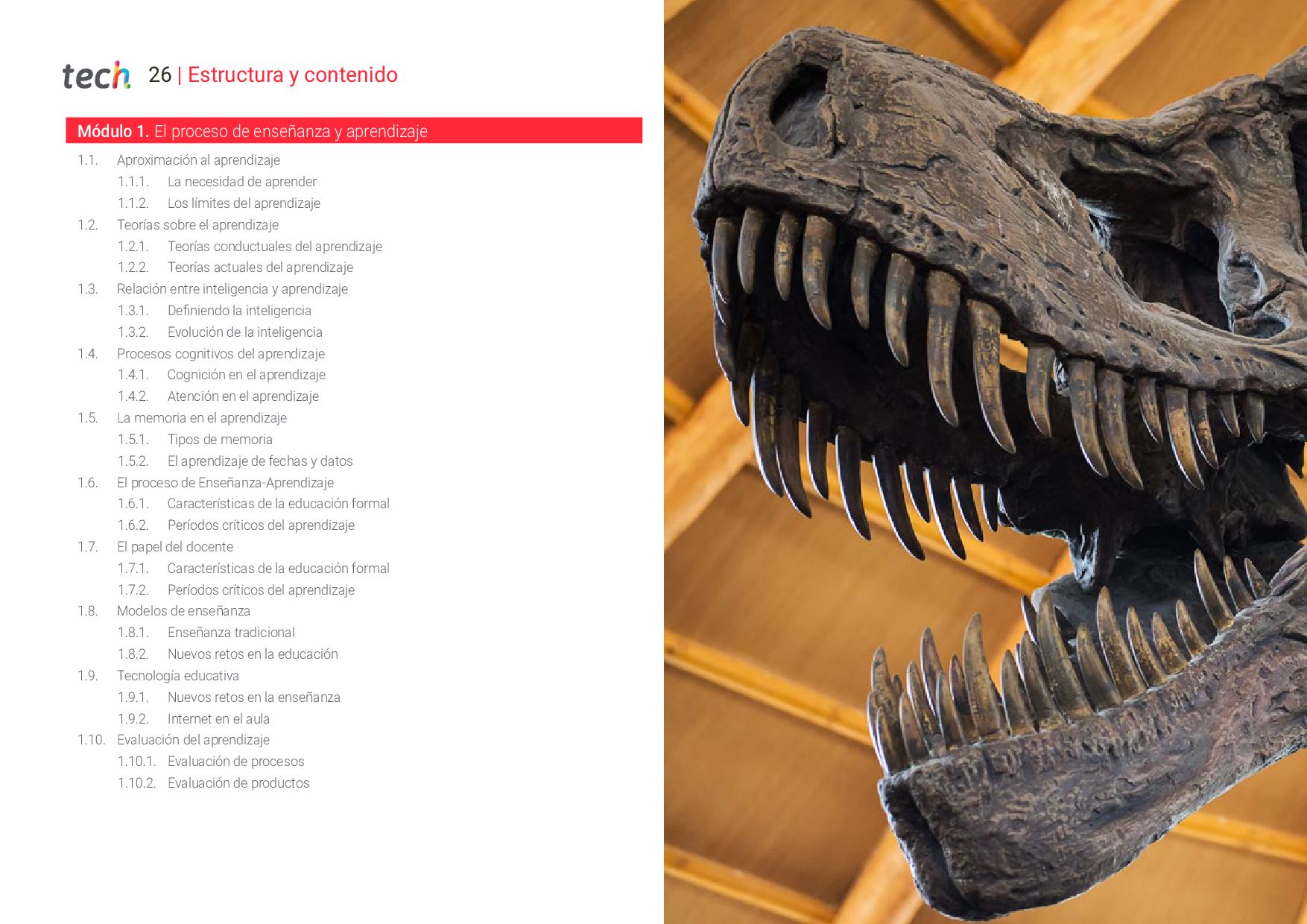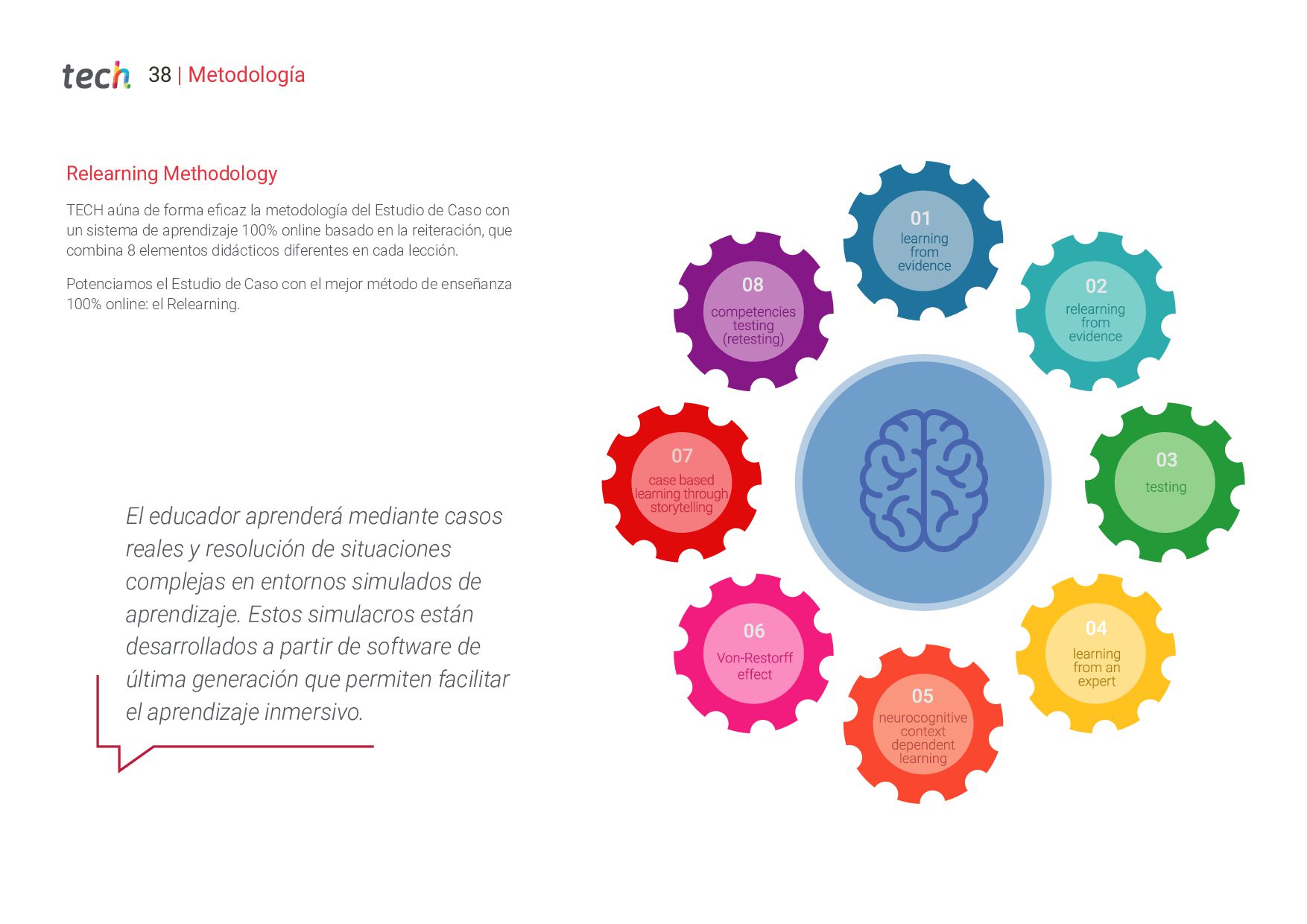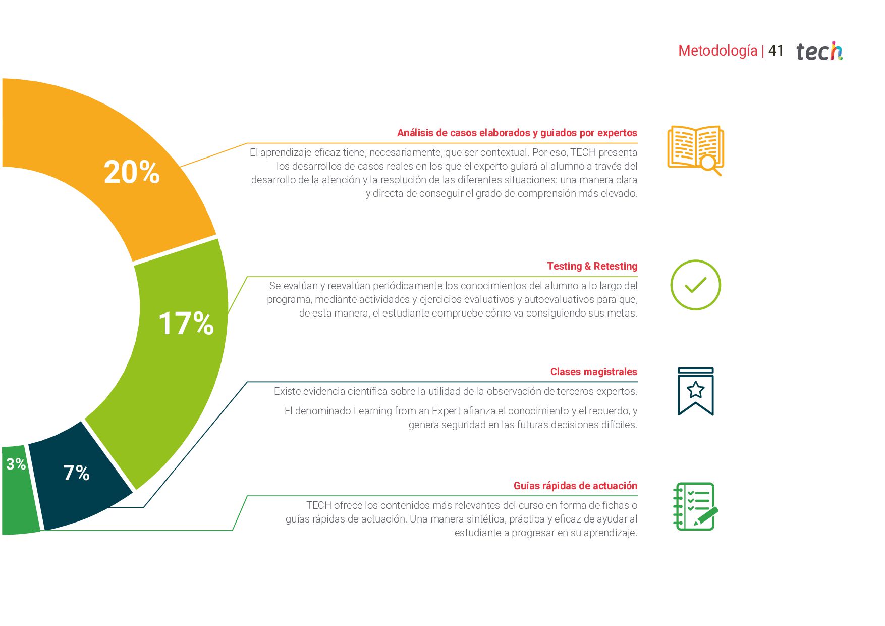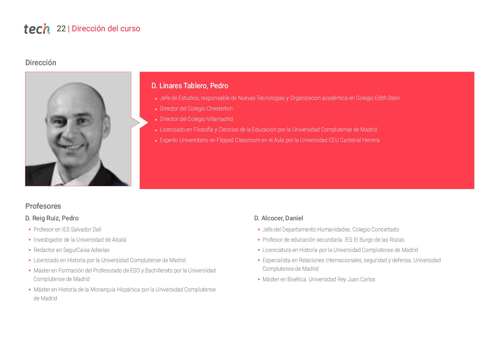 en la enseñanza de las Ciencias Humanas ha diseñado una hoja de ruta en la que se ha prestado especial cuidado en establecer una relación secuencial entre los contenidos que se presentan y su posterior relación con los recursos. El diseño, dirigido a profesores de Ciencias Sociales, se ha basado en la realidad favoreciendo un aprendizaje holístico y significativo. Se ha tenido especial y cuidado en la representación de entornos de aprendizaje motivadores encaminados a construir una actitud favorable ante los nuevos conocimientos. El ritmo, la dificultad y la complejidad de las metodologías avanzan con el programa y, con éste, el proceso evaluador que se centra en recopilar evidencias de aprendizaje al final de cada sección y de cada módulo. Una vez finalizado el programa, el docente habrá manejado un elenco de actividades, herramientas y contenidos lo suficientemente amplio que le capacitarán para guiar a sus alumnos en aquellas tareas que lo necesiten, sugerir otras que puedan realizar por sí mismos e, incluso, proponer un tercer grupo de tareas: las que se realizan con un carácter social y colaborativo. Una de las aportaciones más relevantes consiste en capacitar al docente para definir sus propios diseños instruccionales. Podrá extrapolar las técnicas y estrategias metodológicas utilizadas tales como: gestión de proyectos; elaboración de presentaciones, esquemas y mapas mentales; creación de documentos (infografías, mapas, audios, álbumes, tablones, ejes cronológicos, etc.); creación de blogs educativos y Wikis almacenando información en “la nube”, y mucho más que caracteriza la escuela del siglo XXI. Este Máster Título Propio en Didáctica de las Ciencias Políticas, Geografía e Historia Universal en Secundaria contiene el programa más completo y actualizado del mercado. Sus características más destacadas son: Desarrollo de más de 75 casos prácticos presentados por expertos en Didáctica de las Ciencias Políticas, Geografía e Historia Universal en Secundaria Sus contenidos gráficos, esquemáticos y eminentemente prácticos con los que están concebidos, recogen una información científica y práctica sobre aquellas disciplinas indispensables para el ejercicio profesional Novedades sobre el empleo de la Didáctica de las Ciencias Políticas, Geografía e Historia Universal en Secundaria Contiene ejercicios prácticos donde realizar el proceso de autoevaluación para mejorar el aprendizaje Sistema interactivo de aprendizaje basado en algoritmos para la toma de decisiones sobre las situaciones planteadas Con especial hincapié en metodologías basadas en la evidencia en Didáctica de las Ciencias Políticas, Geografía e Historia Universal en Secundaria Todo esto se complementará con lecciones teóricas, preguntas al experto, foros de discusión de temas controvertidos y trabajos de reflexión individual Disponibilidad de los contenidos desde cualquier dispositivo fijo o portátil con conexión a internet Actualiza tus conocimientos a través del programa en Didáctica de las Ciencias Políticas, Geografía e Historia Universal en Secundaria”