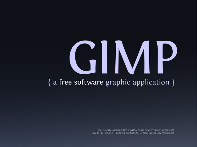 Font courtesy of www.josbuivenga.demon.nl/fontin.html GIMP - A free software graphic application by Andrew Abogado is licensed under a Creative Commons Attribution-Noncommercial 3.0 Philippines License claimid.com/andotyjazz