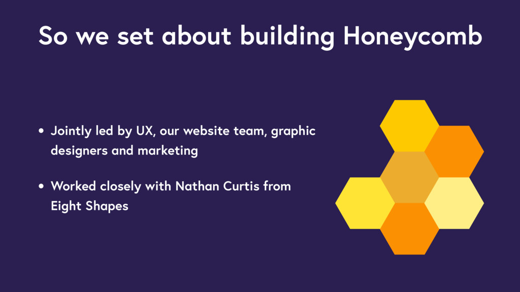 This session is a case study aiming to give an overview of how we have used our design system, Honeycomb. Most talks on design systems focus on building a web toolkit, or library, with a bunch of developer ready components. But I want to show how we have created a number of resources for designers to speed up how they create designs before they hand over to developers.
