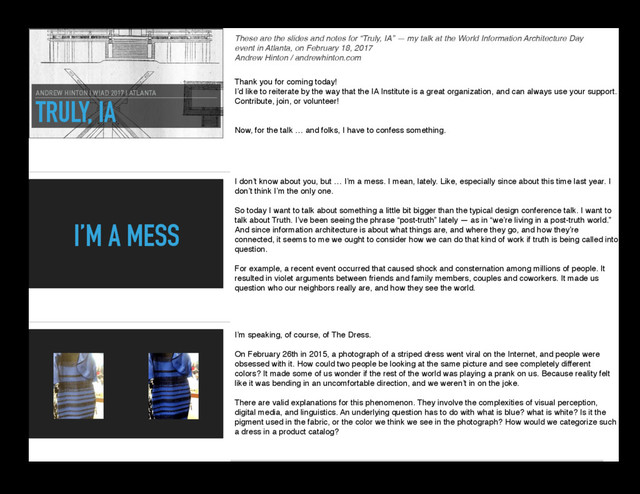 A MESS These are the slides and notes for “Truly, IA” — my talk at the World Information Architecture Day event in Atlanta, on February 18, 2017 Andrew Hinton / andrewhinton.com I don’t know about you, but … I’m a mess. I mean, lately. Like, especially since about this time last year. I don’t think I’m the only one. So today I want to talk about something a little bit bigger than the typical design conference talk. I want to talk about Truth. I’ve been seeing the phrase “post-truth” lately — as in “we’re living in a post-truth world.” And since information architecture is about what things are, and where they go, and how they’re connected, it seems to me we ought to consider how we can do that kind of work if truth is being called into question. For example, a recent event occurred that caused shock and consternation among millions of people. It resulted in violet arguments between friends and family members, couples and coworkers. It made us question who our neighbors really are, and how they see the world. I’m speaking, of course, of The Dress. On February 26th in 2015, a photograph of a striped dress went viral on the Internet, and people were obsessed with it. How could two people be looking at the same picture and see completely different colors? It made some of us wonder if the rest of the world was playing a prank on us. Because reality felt like it was bending in an uncomfortable direction, and we weren’t in on the joke. There are valid explanations for this phenomenon. They involve the complexities of visual perception, digital media, and linguistics. An underlying question has to do with what is blue? what is white? Is it the pigment used in the fabric, or the color we think we see in the photograph? How would we categorize such a dress in a product catalog? Thank you for coming today! I’d like to reiterate by the way that the IA Institute is a great organization, and can always use your support. Contribute, join, or volunteer! Now, for the talk … and folks, I have to confess something.