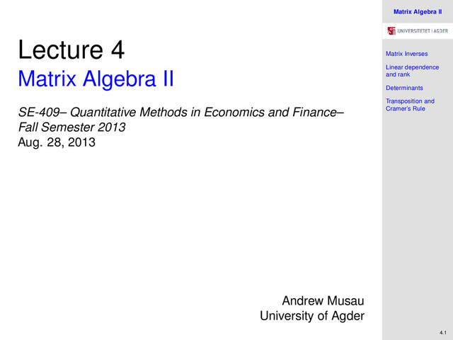 Transposition and Cramer’s Rule 4.1 Lecture 4 Matrix Algebra II SE-409– Quantitative Methods in Economics and Finance– Fall Semester 2013 Aug. 28, 2013 Andrew Musau University of Agder