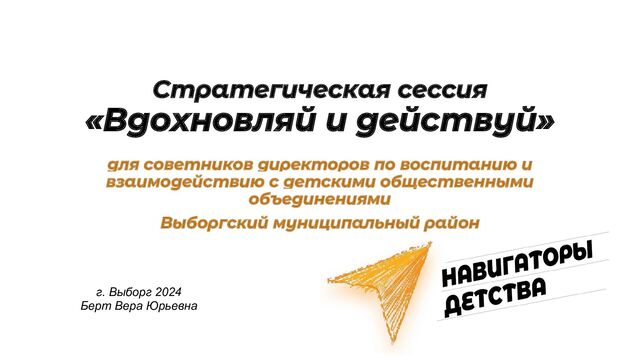 молодёжи) Время Мероприятие Спикеры/Ответственные 10.00-10.30 Регистрация участников 10.30-11.00 Открытие стратегической сессии «Вдохновляй и действуй» Анненкова Е.В., советник директора по воспитанию и взаимодействию с детскими общественными объединениями Берт В.Ю., муниципальный координатор проекта «Навигаторы детства» 11.05 – 13.05 Круглый стол «Движение Первых и Навигаторы детства – единство в подходах реализации Новой философии воспитания» Павлов Илья Андреевич, заместитель председателя регионального отделения «Движения Первых» Берт В.Ю. Муниципальный координатор проекта «Навигаторы детства» 14.00 – 15.30 Мастер-класс «Посты и инфографика: искусство эффектного контента» Шилина Мария Сергеевна, специалист по медиасопровождению проекта «Навигаторы детства» в Ленинградской области 15.30 – 16.00 Обратная связь Все участники 16.00 – 17.00 Практическое занятие «Звуковые медитации» Самарина Анастасия, основатель и руководитель студии йоги и фитнеса, преподаватель хадха-йоги и кундалини-йоги