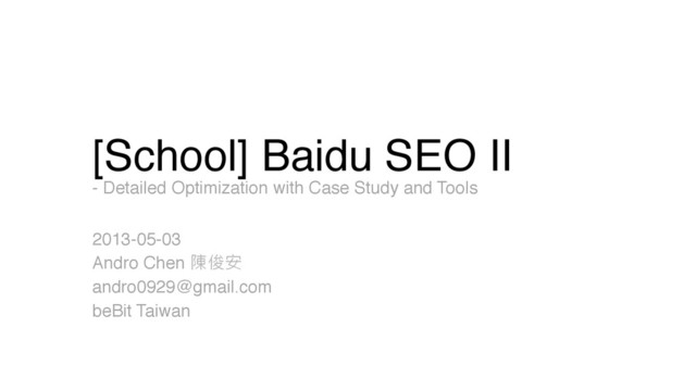 1. 2013-04-19 [School] Baidu SEO - A Practical Guide (https://speakerdeck.com/androchen/baidu-seo-a-practical-guide/) 2. 2013-05-03 [School] Baidu SEO II (https://speakerdeck.com/androchen/baidu-seo-ii)