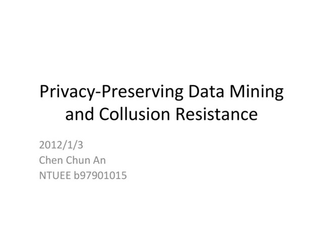 Lin, M.Y. Zhu. Tools for Privacy Preserving Distributed Data Mining. • [2] Vaidya, J., Clifton, C. Privacy-preserving data mining: why, how, and when. • [3] S. Urabe, J. Wang, E. Kodama and T. Takata. A High Collusion- Resistant Approach to Distributed Privacy-Preserving Data Mining • [4] Samuel Shepard, Ray Kresman, Larry Dunning. Data Mining and Collusion Resistance. • [5] Bin Yang, Hiroshi Nakagawa, Issei Sato, Jun Sakuma. Collusion-‐ Resistant Privacy-‐Preserving Data Mining. • See more in Privacy-‐Preserving Data Mining and Collusion Resistance. 15 NTUEE b97 Chen Chun An