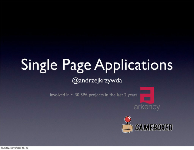 backend • users love it • customers love it • developers love it • “it’s the best thing since Rails” • “I prefer to work on SPA than on the backend” Sunday, November 18, 12