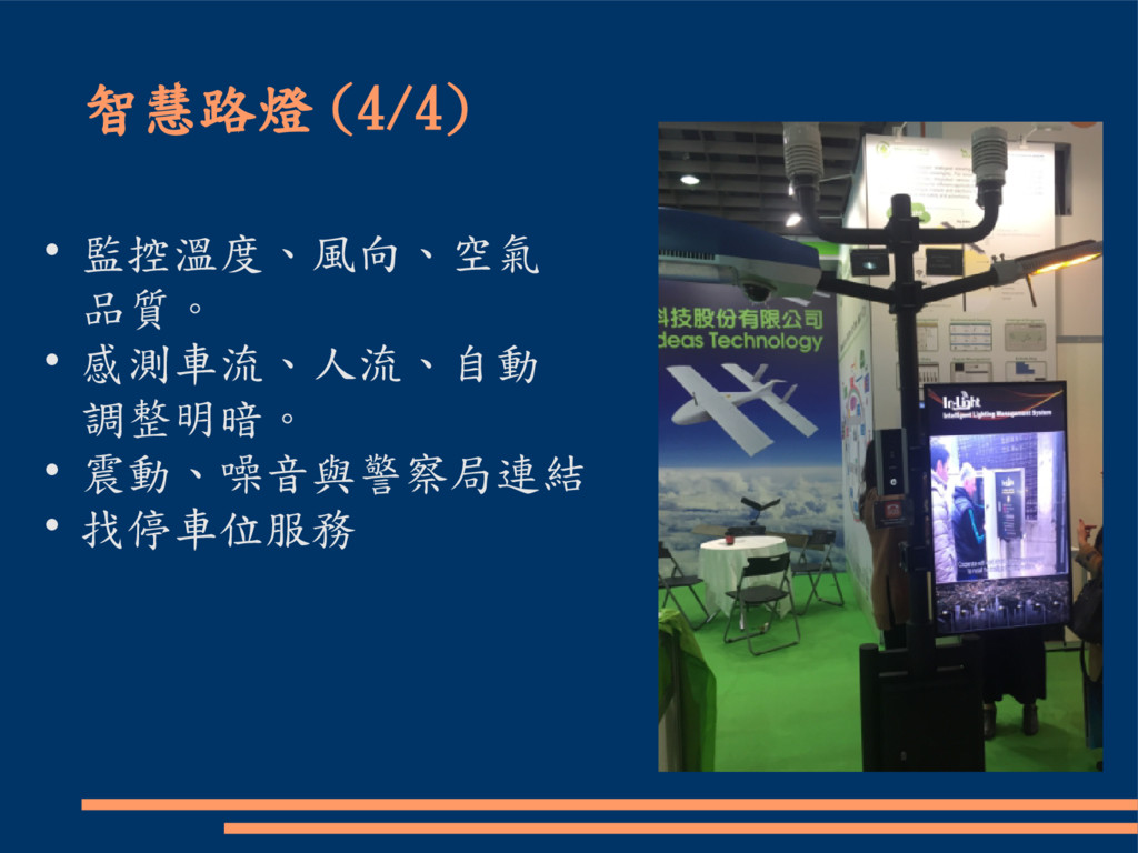 智慧路燈 (4/4) 監控溫度、風向、空氣 品質。 感測車流、人流、自動 調整明暗。 震動、噪音與警察局連結