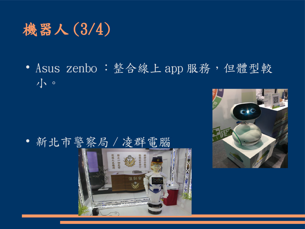 機器人 (3/4) Asus zenbo :整合線上 app 服務,但體型較 小。