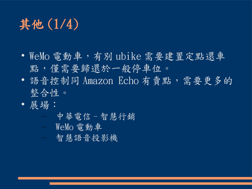 Amazon Echo 有賣點,需要更多的 整合性。 展場: – 中華電信 - 智慧行銷 – WeMo 電動車 – 智慧語音投影機