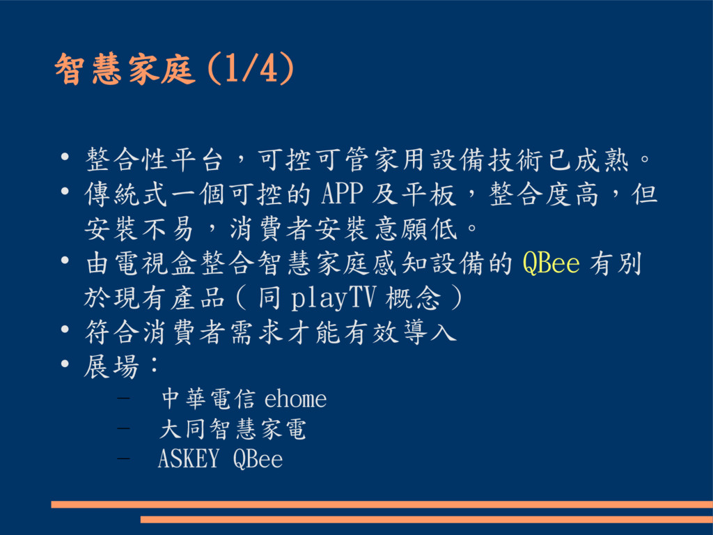 由電視盒整合智慧家庭感知設備的 QBee 有別 於現有產品 ( 同 playTV 概念 ) 符合消費者需求才能有效導入 展場: – 中華電信 ehome – 大同智慧家電 – ASKEY QBee