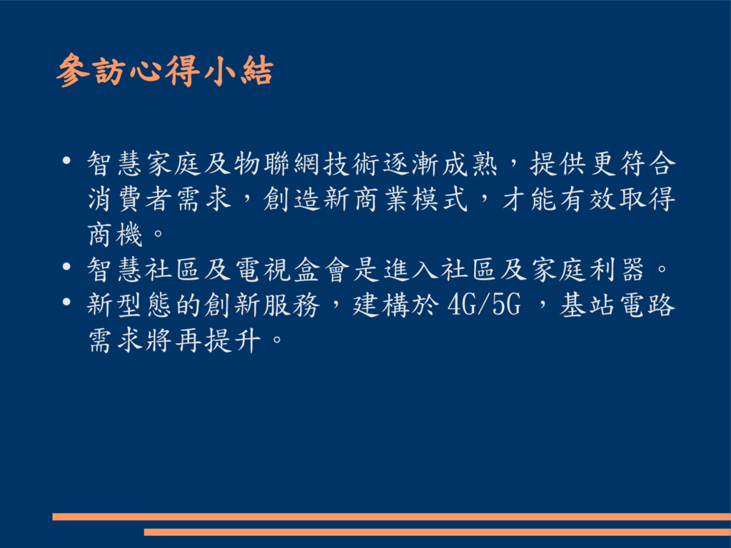 參訪心得小結 智慧家庭及物聯網技術逐漸成熟,提供更符合 消費者需求,創造新商業模式,才能有效取得 商機。 智慧社區及電視盒會是進入社區及家庭利器。 新型態的創新服務,建構於 4G/5G
