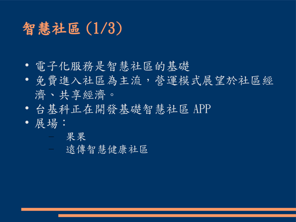 智慧社區 (1/3) 電子化服務是智慧社區的基礎 免費進入社區為主流,營運模式展望於社區經 濟、共享經濟。 台基科正在開發基礎智慧社區 APP