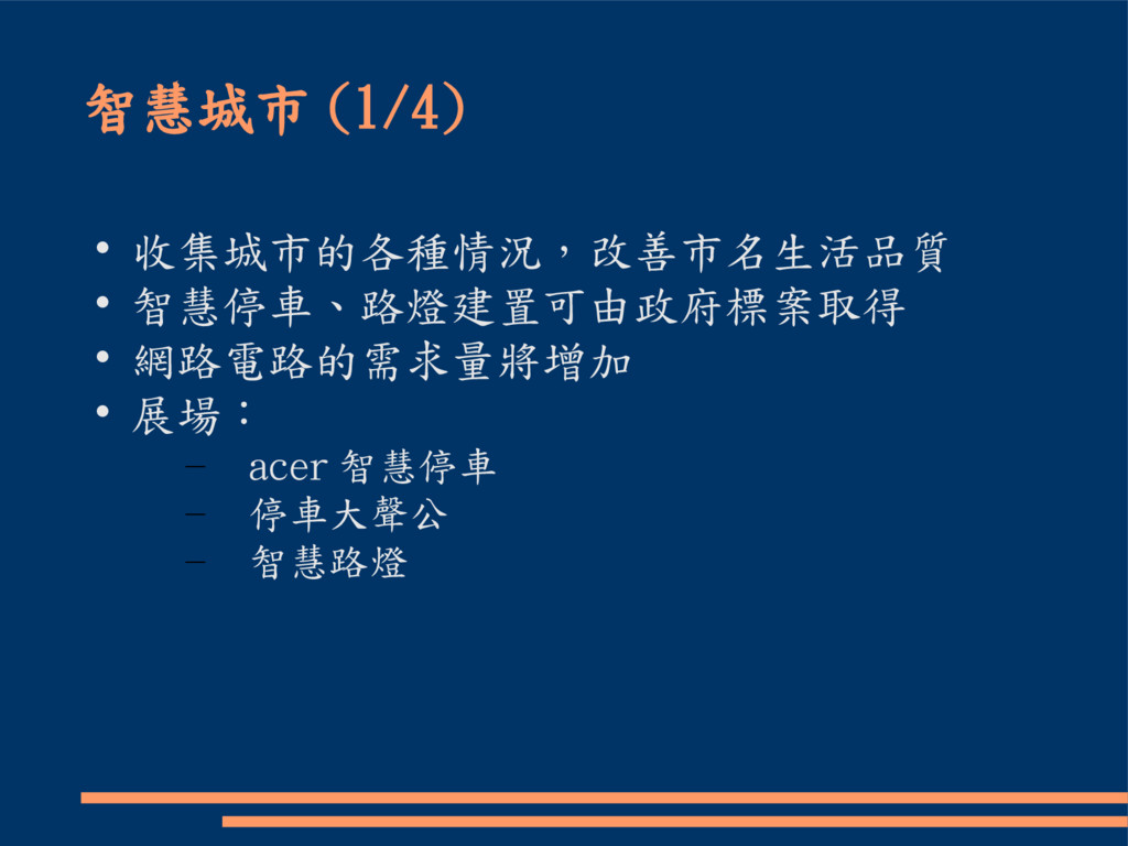 智慧城市 (1/4) 收集城市的各種情況,改善市名生活品質 智慧停車、路燈建置可由政府標案取得 網路電路的需求量將增加 展場: