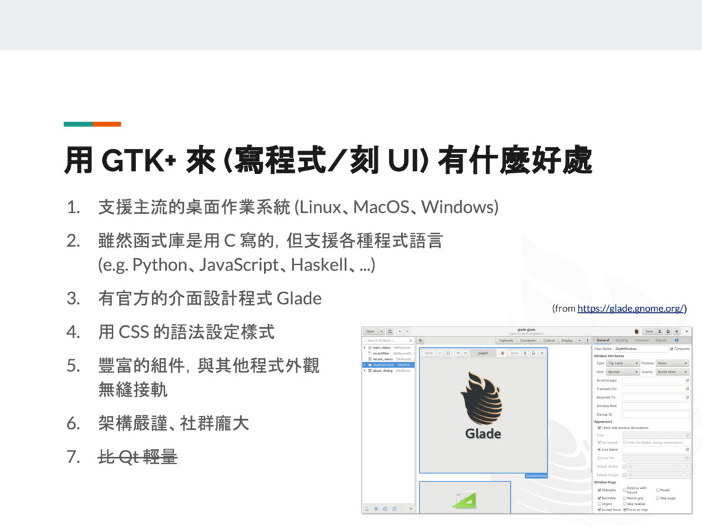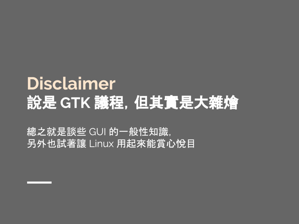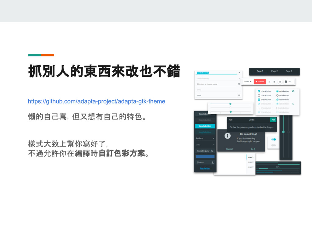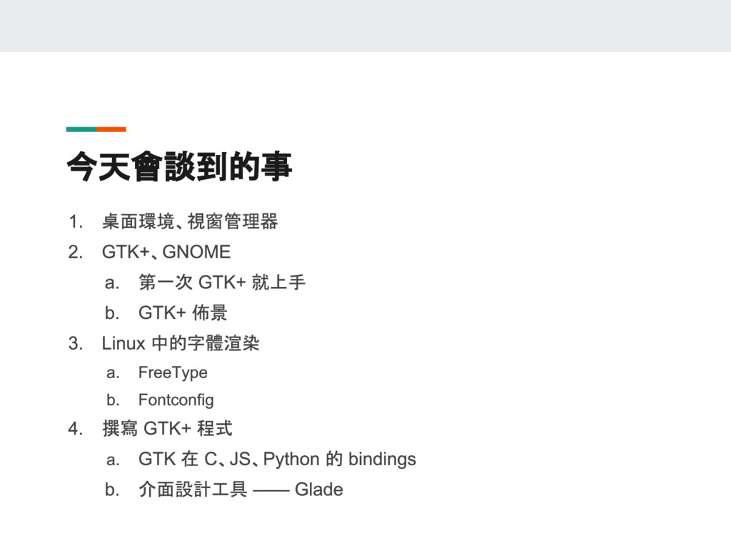 有鑑於網路上的參考資料紛雜,且 GTK 版本更迭快速,這門議程想要以兩位 GNOME 愛好者的生活經驗出發,深入淺出介紹使用 GTK+ 的祕訣,讓 GNOME 成為更加賞心悅目且適合日常使用的桌面環境。這門議程中還會教各位怎麼以 Python 撰寫 GTK 程式,讓您能用熟悉的語言,輕輕鬆鬆寫出跨平台的原生桌面應用程式!