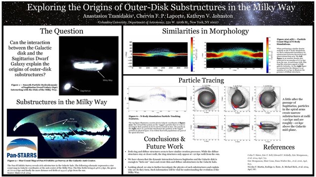 Anastasios Tzanidakis1, Chervin F. P. Laporte, Kathryn V. Johnston 1Columbia University, Department of Astronomy, 550 W. 120th St., New York, NY 10027 Ring Structures Diffuse Structures Figure 2— Star Count Map of Pan-STARRS1 3π Survey at the Galactic Anti-Center. The Pan-STARRS1 Survey reveals rich substructure in the Galactic halo. The following schematic represents a star count map in Galactic coordinates at the anti-center of the Milky Way. The blue fields being at 4.8-6.3 kpc, the green at 7.6-11.0 kpc and finally the more distance red fields at 14.4-17.4 kpc from the sun. Source: Slater et al. 2014. Figure 6— N-Body Simulation Particle Tracking Features. The top figure illustrates a scatter plot in Galactic coordinates of figure 2(a). The red and blue points are the “tagged” particles that we want to investigate their position in (X,Y) and (X,Z) back in time. The panels on the right, show at 3 particular timeframes the position of the tagged particles in physical space. It is evident that both populations are part of the spiral structure. Figure 2(a),2(b) — Particle Count Map of N-Body Simulations. When performing a similar density analysis on the N-Body simulations, we find a substantial resemblance in substructure between theoretical and observational data sets. The left figure is an number density plot restricted at an annulus of 15-20 kpc from the sun. At such large radii, thin ring like structures appear at high galactic latitudes. On the right figure we parametrize the distance to an annulus of 5-10 kpc to illustrate the presence of diffuse structures. The Question Figure 1 — Smooth Particle Hydrodynamic of Sagittarius Dwarf Galaxy (Sgr) Interacting with the Disk of the Milky Way. Can the interaction between the Galactic disk and the Sagittarius Dwarf Galaxy explain the origins of outer-disk substructures? Similarities in Morphology Substructures in the Milky Way Conclusions & Future Work • Both ring and diffuse structures seem to have similar creation processes. While the diffuse structures stay at closer radii, the ring structures only appear at >20 kpc radii from the sun.