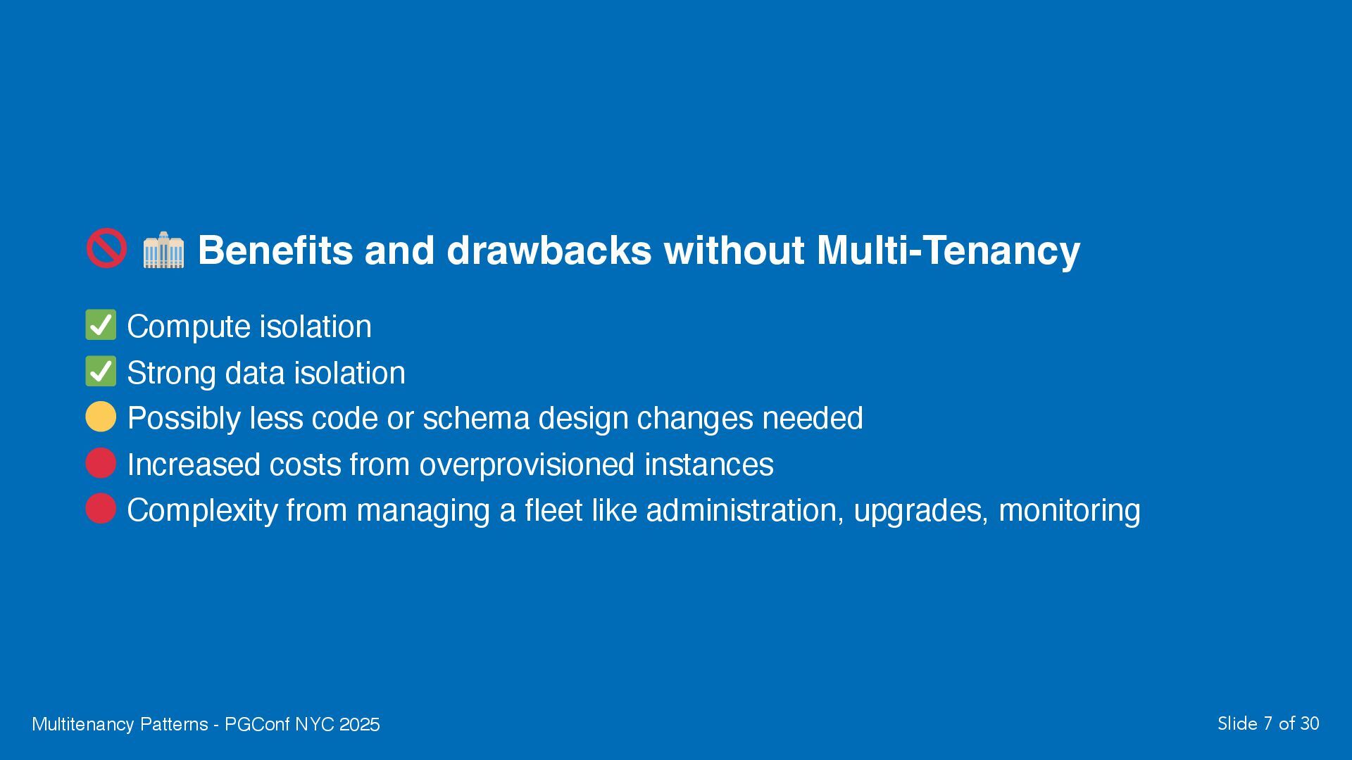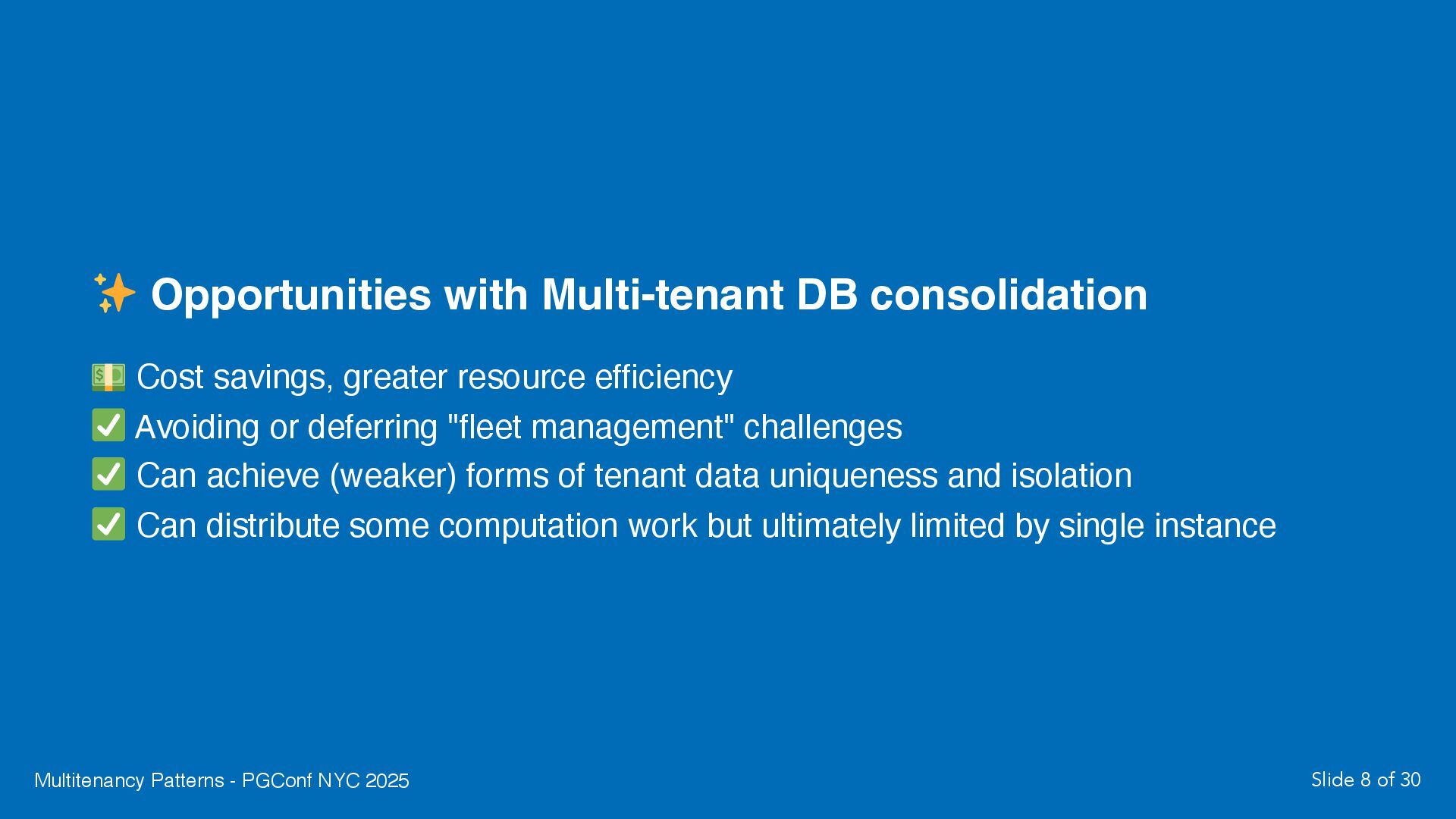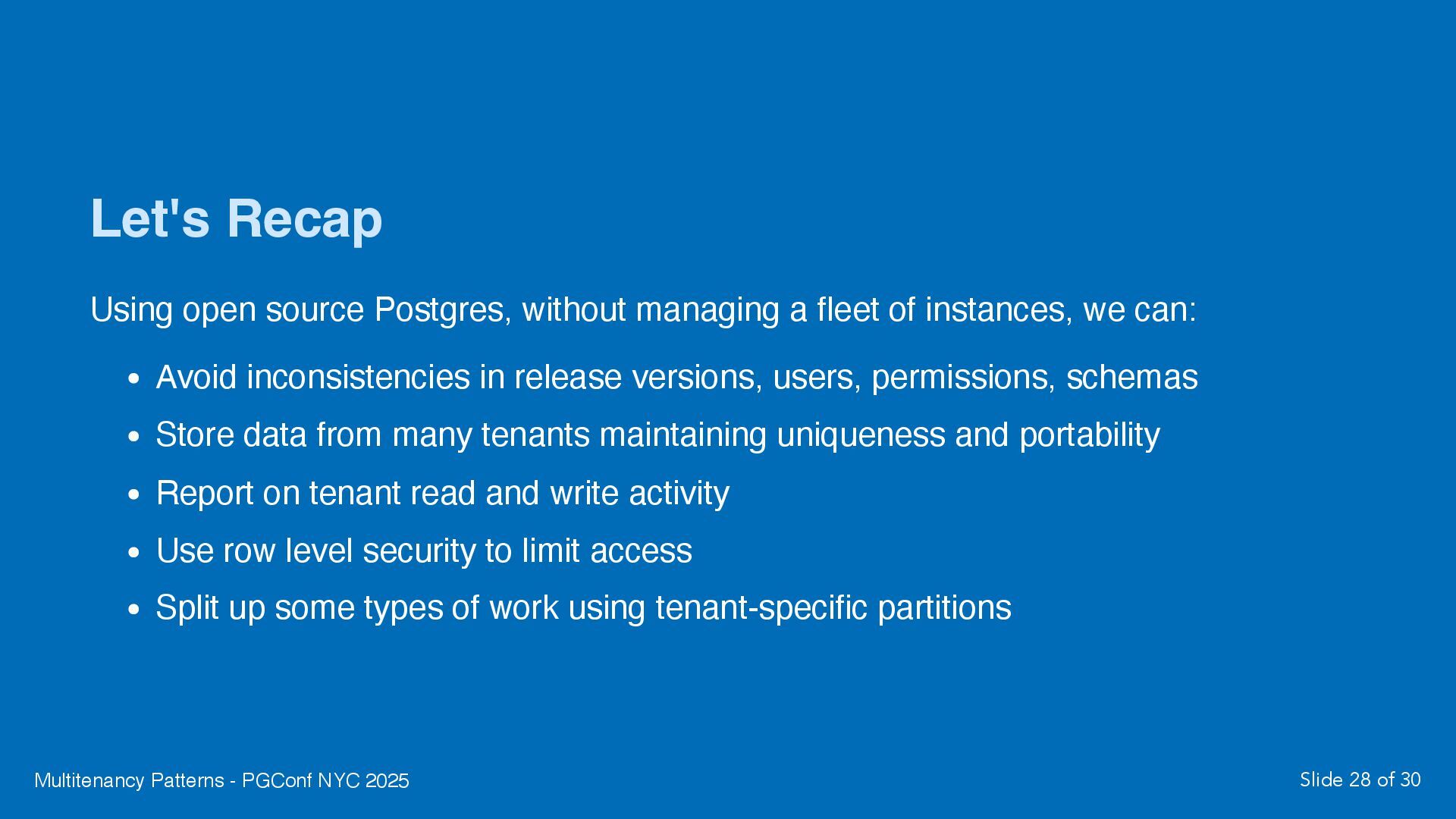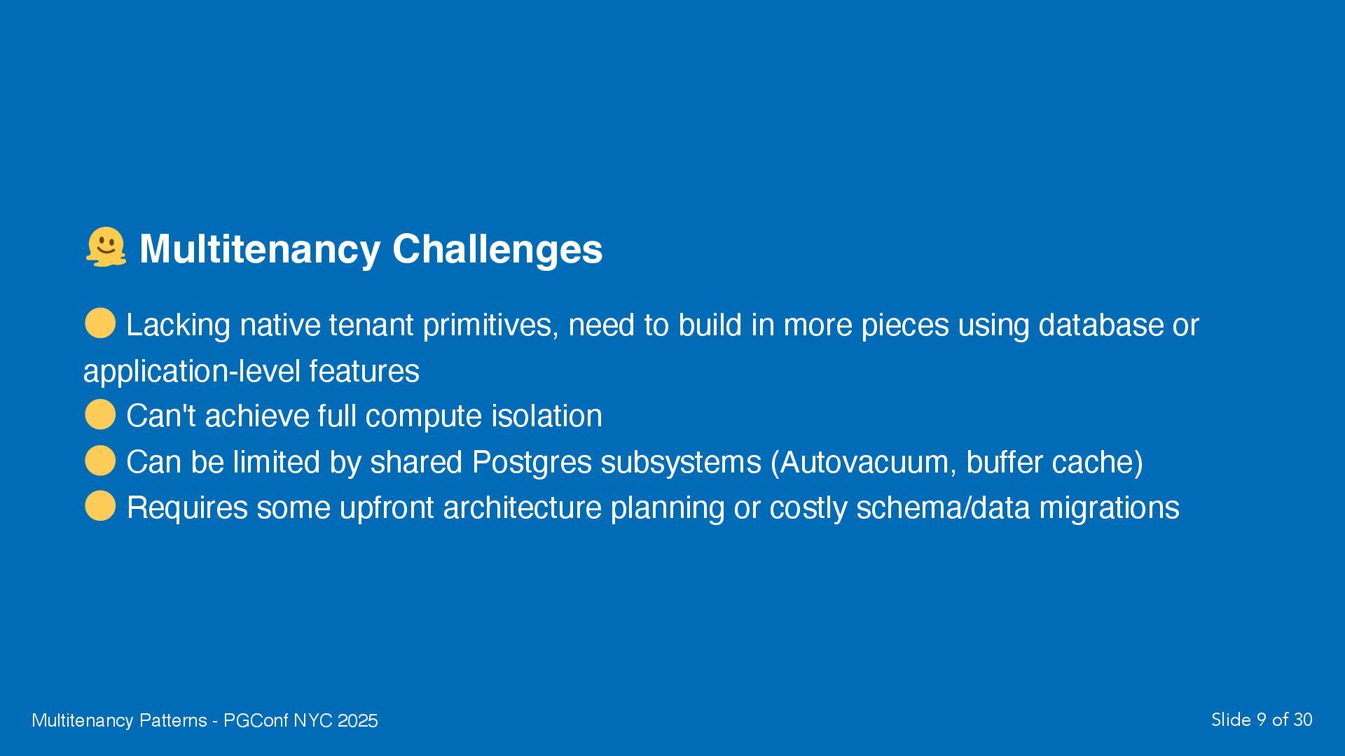 These patterns will help teams design their own Multi-tenant databases so they can maximize cost efficiency by consolidating to fewer Postgres instances. As query volume and data sizes grow, teams may wonder whether these patterns will scale. Recommendations on the limitations of each pattern will be presented as well as alternative solutions, so that attendees gain a broader context on managing growth.