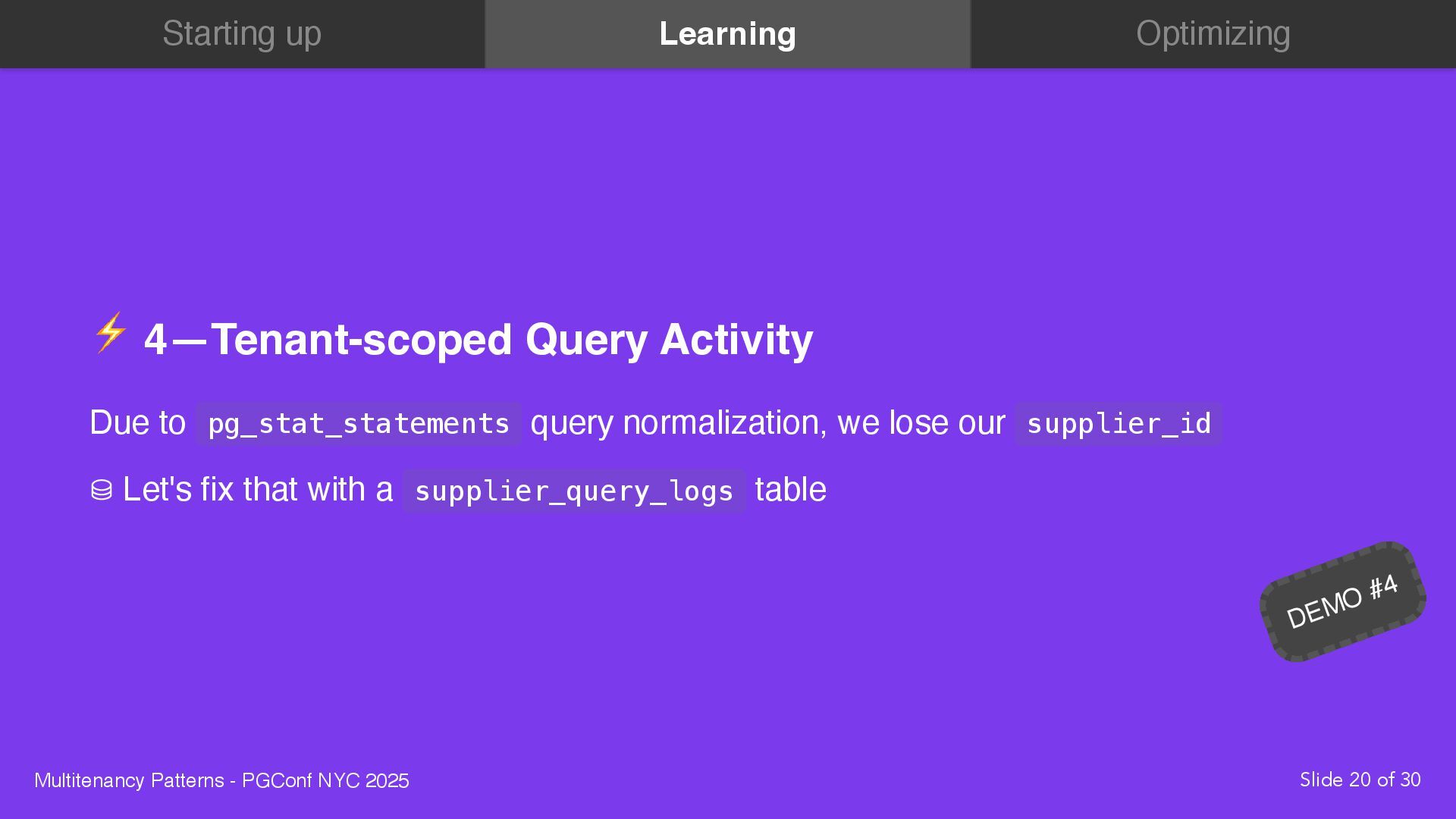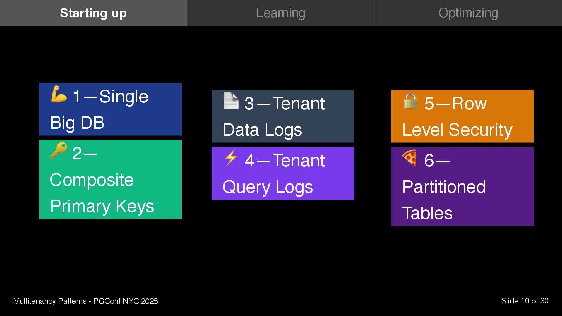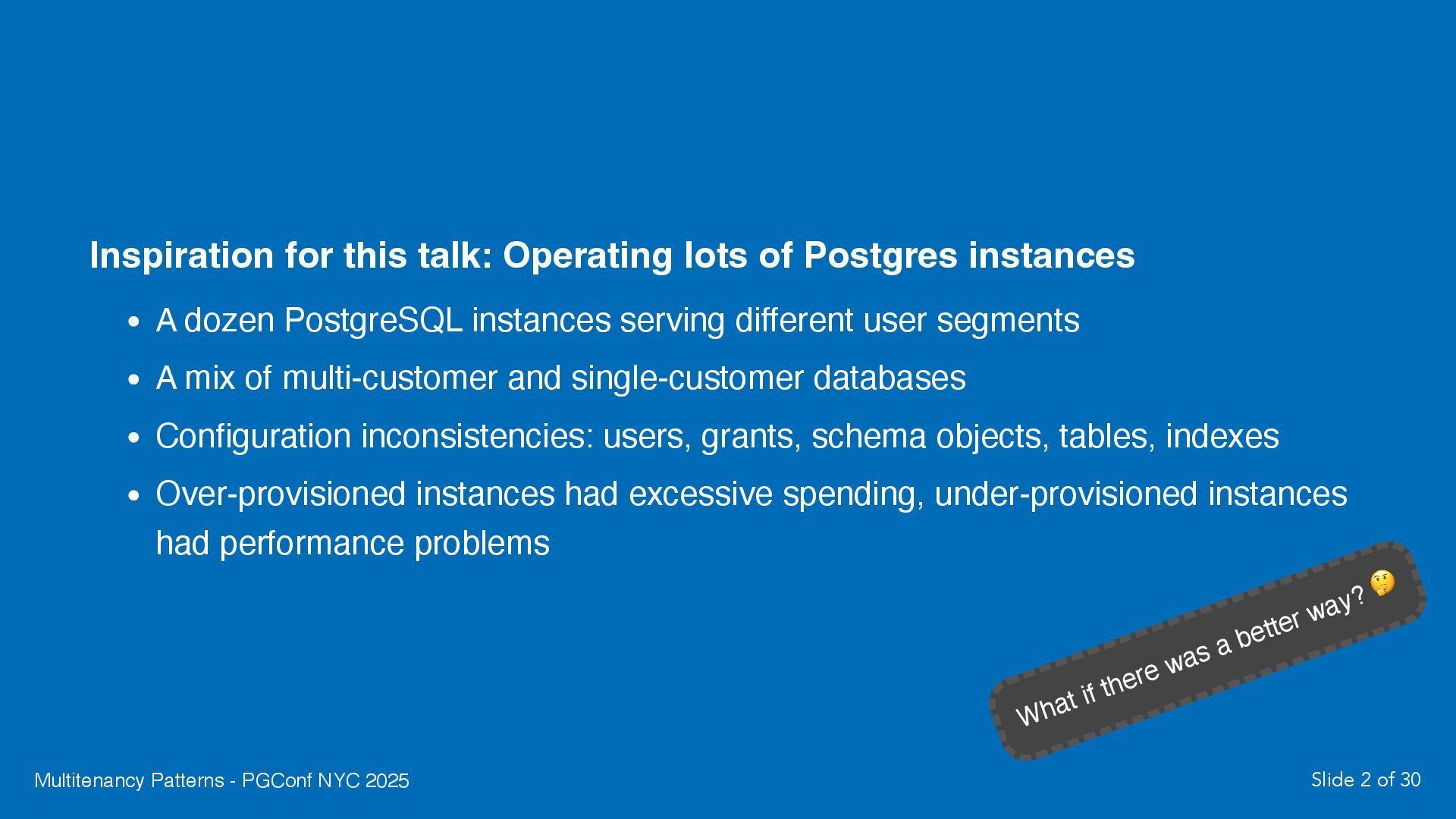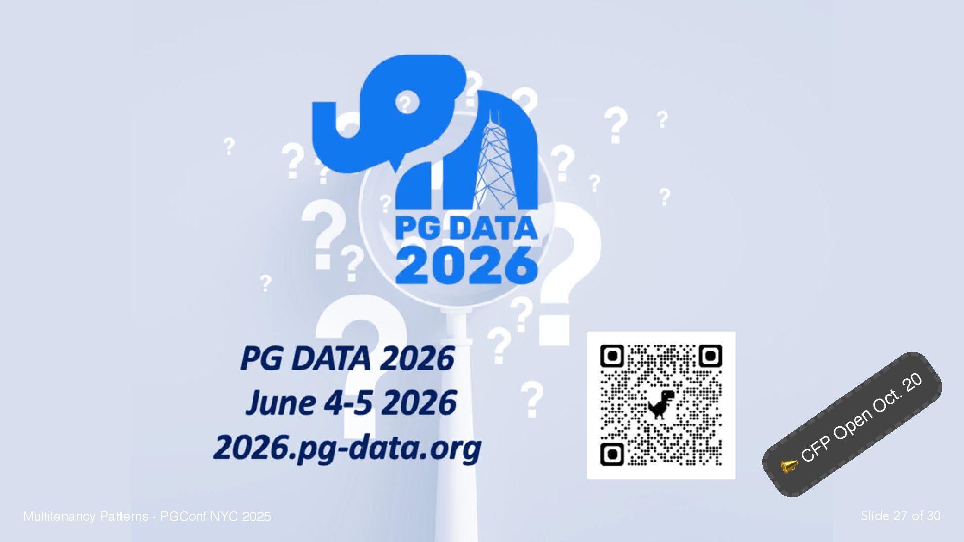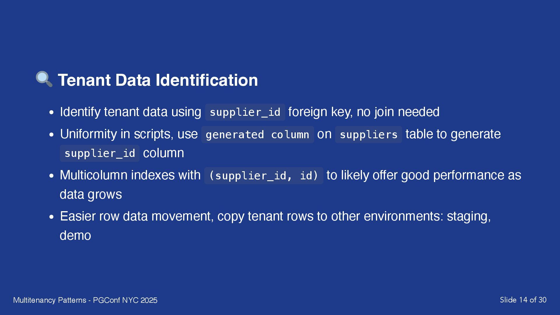 These patterns will help teams design their own Multi-tenant databases so they can maximize cost efficiency by consolidating to fewer Postgres instances. As query volume and data sizes grow, teams may wonder whether these patterns will scale. Recommendations on the limitations of each pattern will be presented as well as alternative solutions, so that attendees gain a broader context on managing growth.