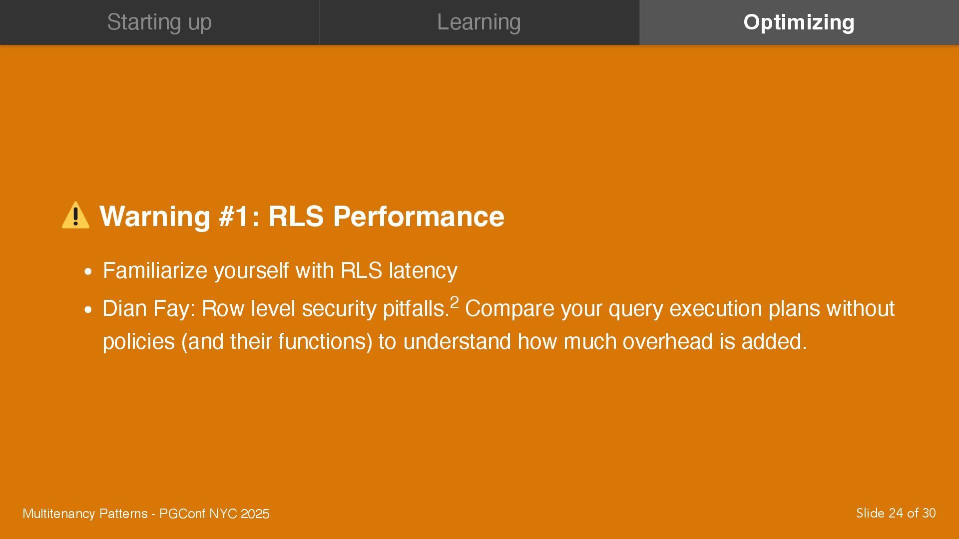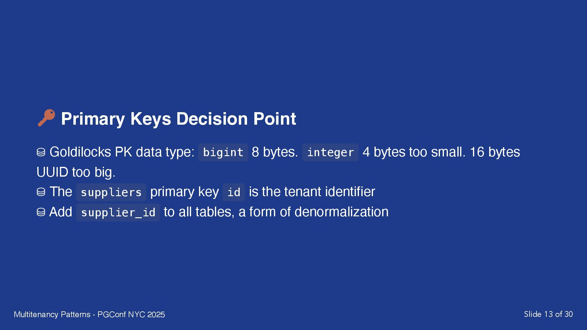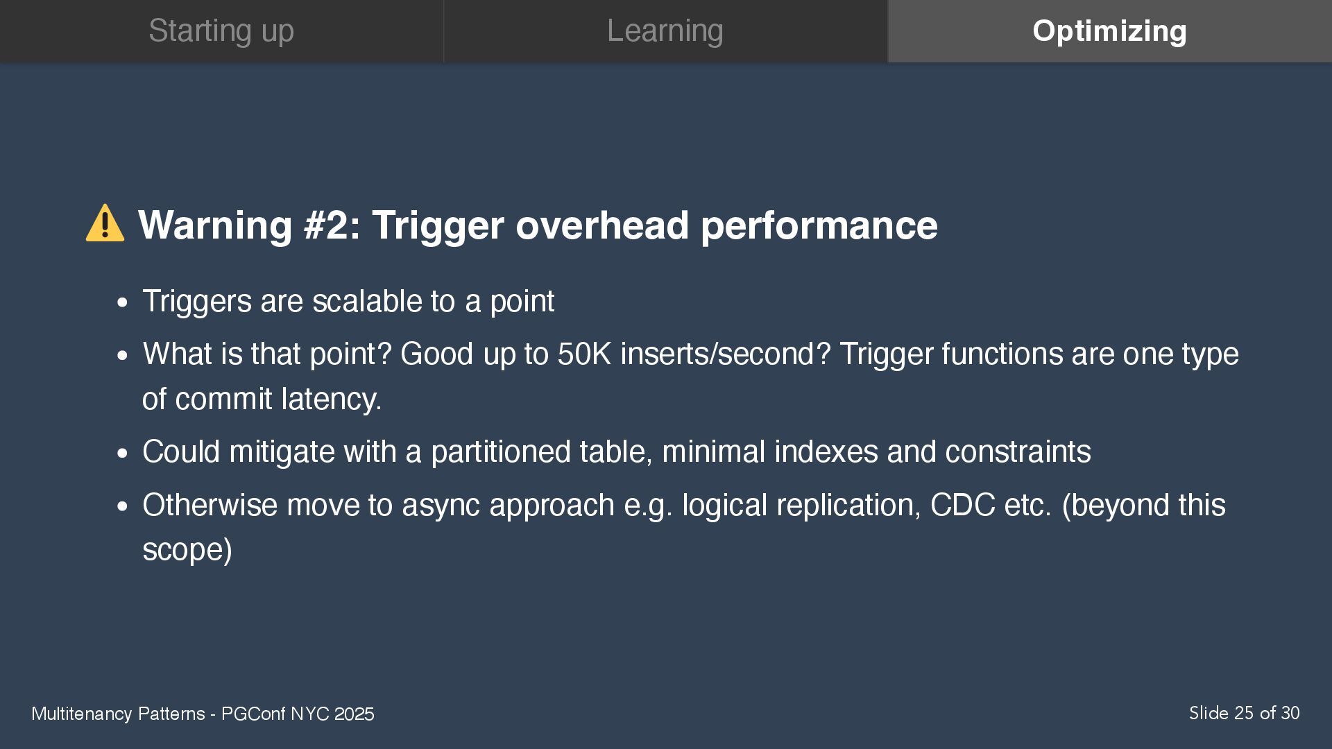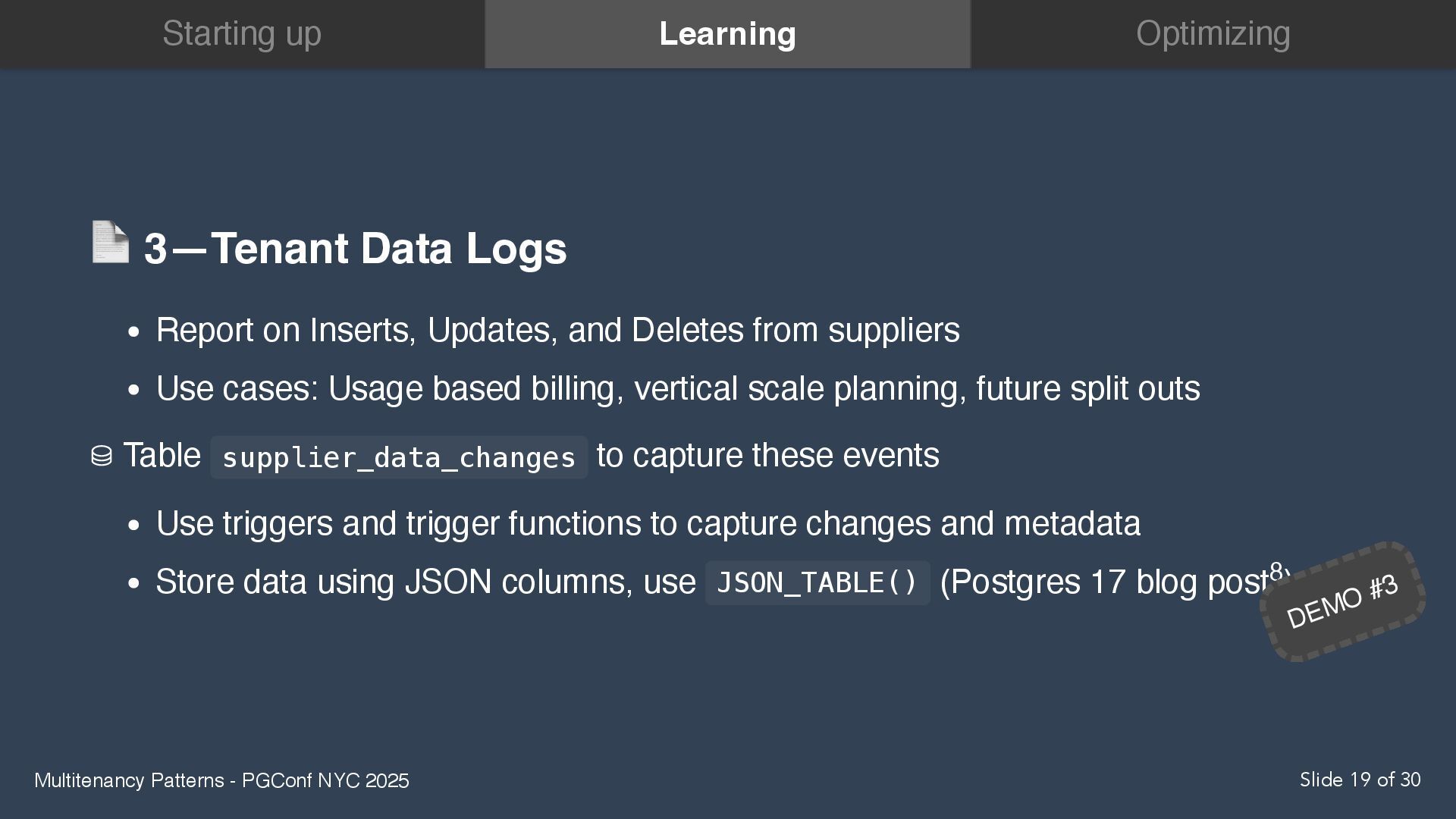 These patterns will help teams design their own Multi-tenant databases so they can maximize cost efficiency by consolidating to fewer Postgres instances. As query volume and data sizes grow, teams may wonder whether these patterns will scale. Recommendations on the limitations of each pattern will be presented as well as alternative solutions, so that attendees gain a broader context on managing growth.