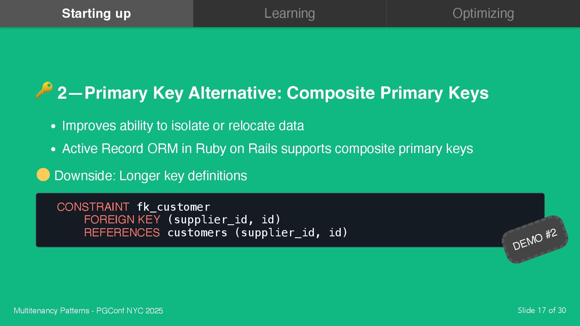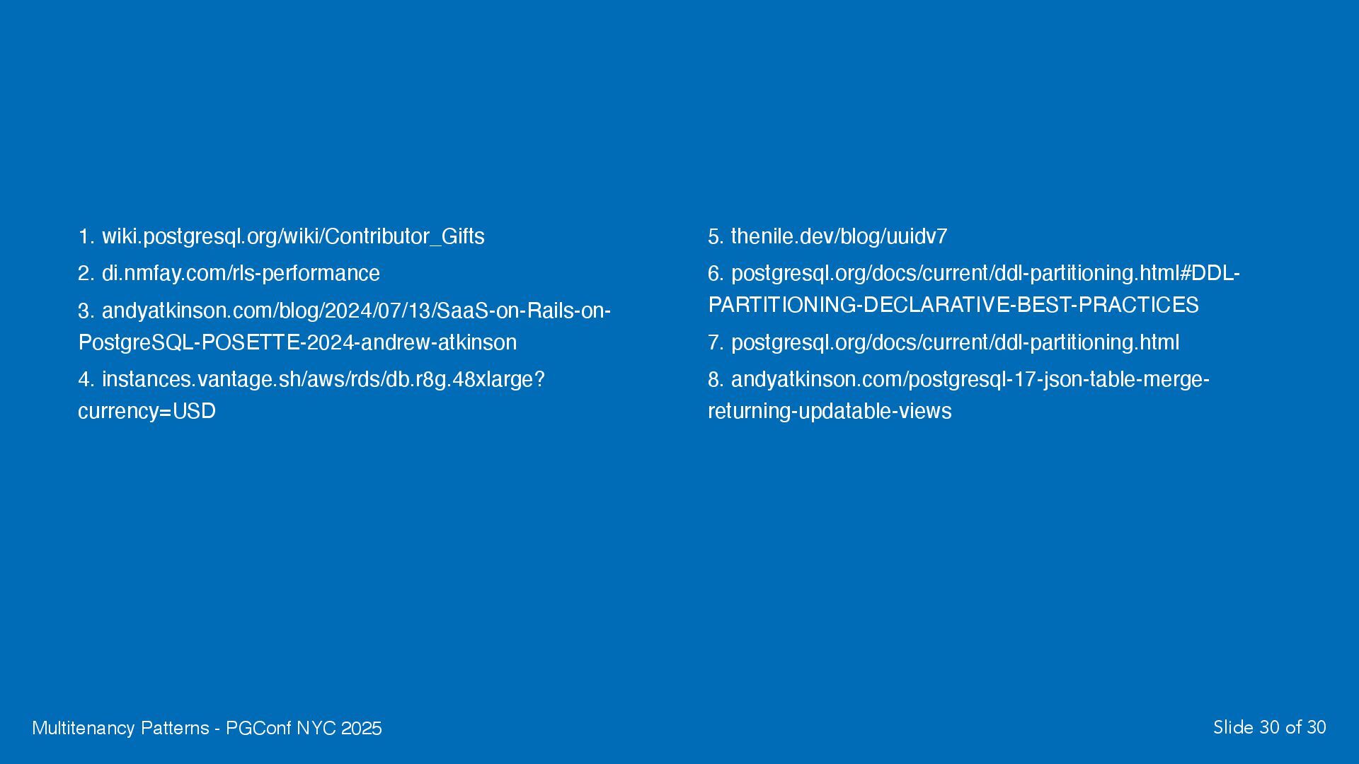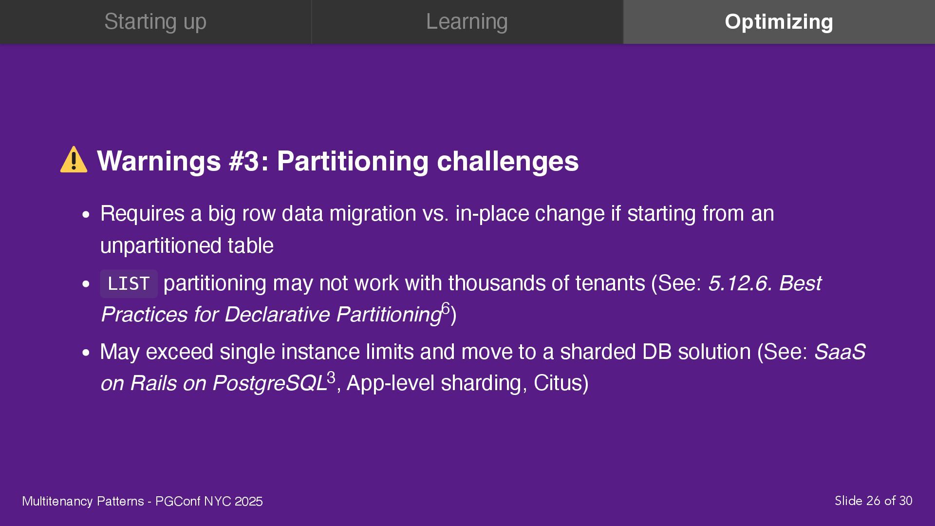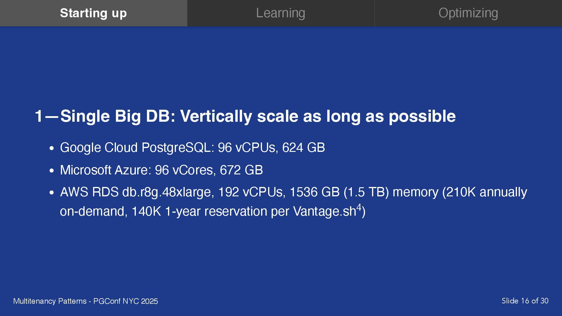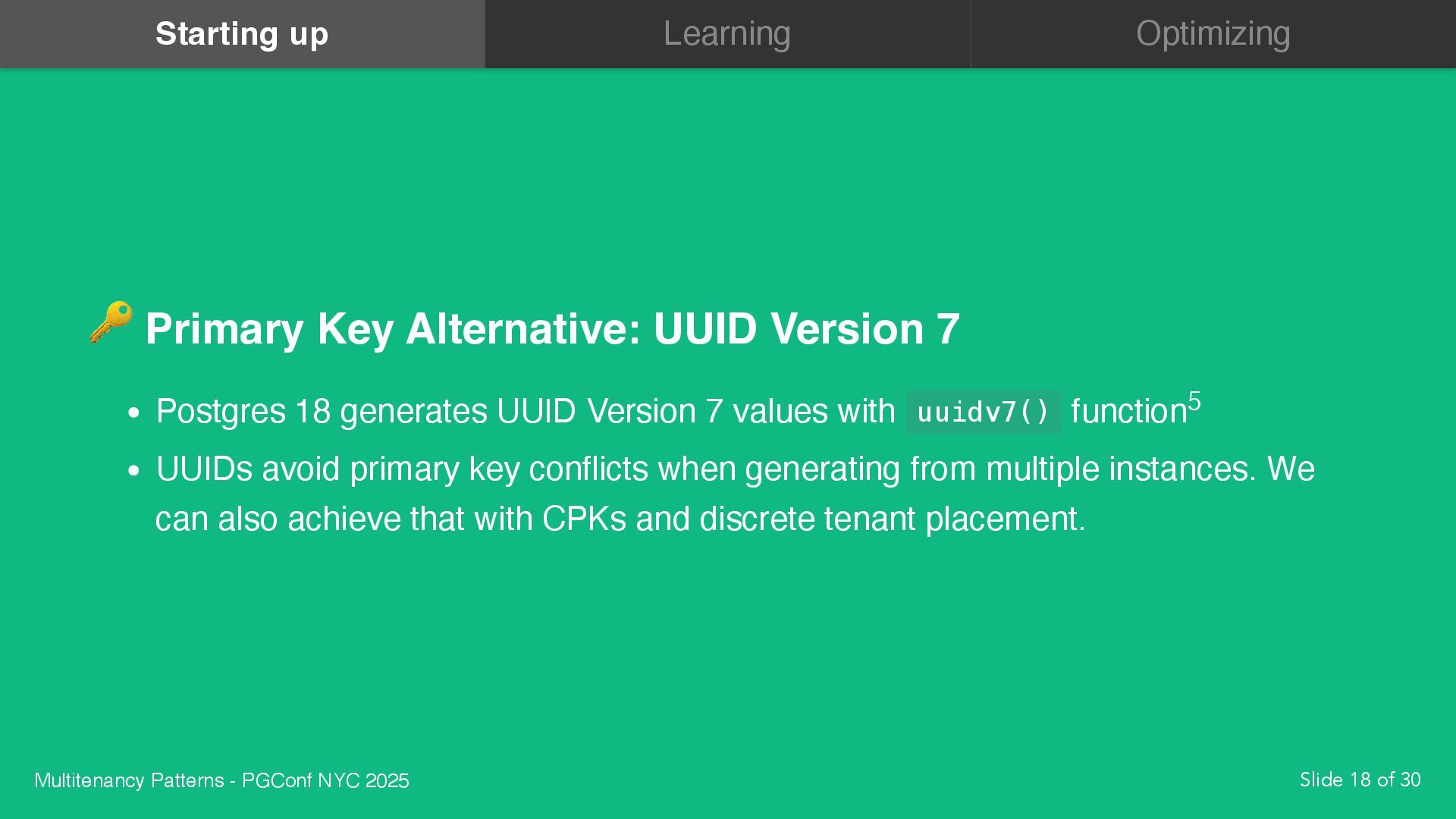 These patterns will help teams design their own Multi-tenant databases so they can maximize cost efficiency by consolidating to fewer Postgres instances. As query volume and data sizes grow, teams may wonder whether these patterns will scale. Recommendations on the limitations of each pattern will be presented as well as alternative solutions, so that attendees gain a broader context on managing growth.