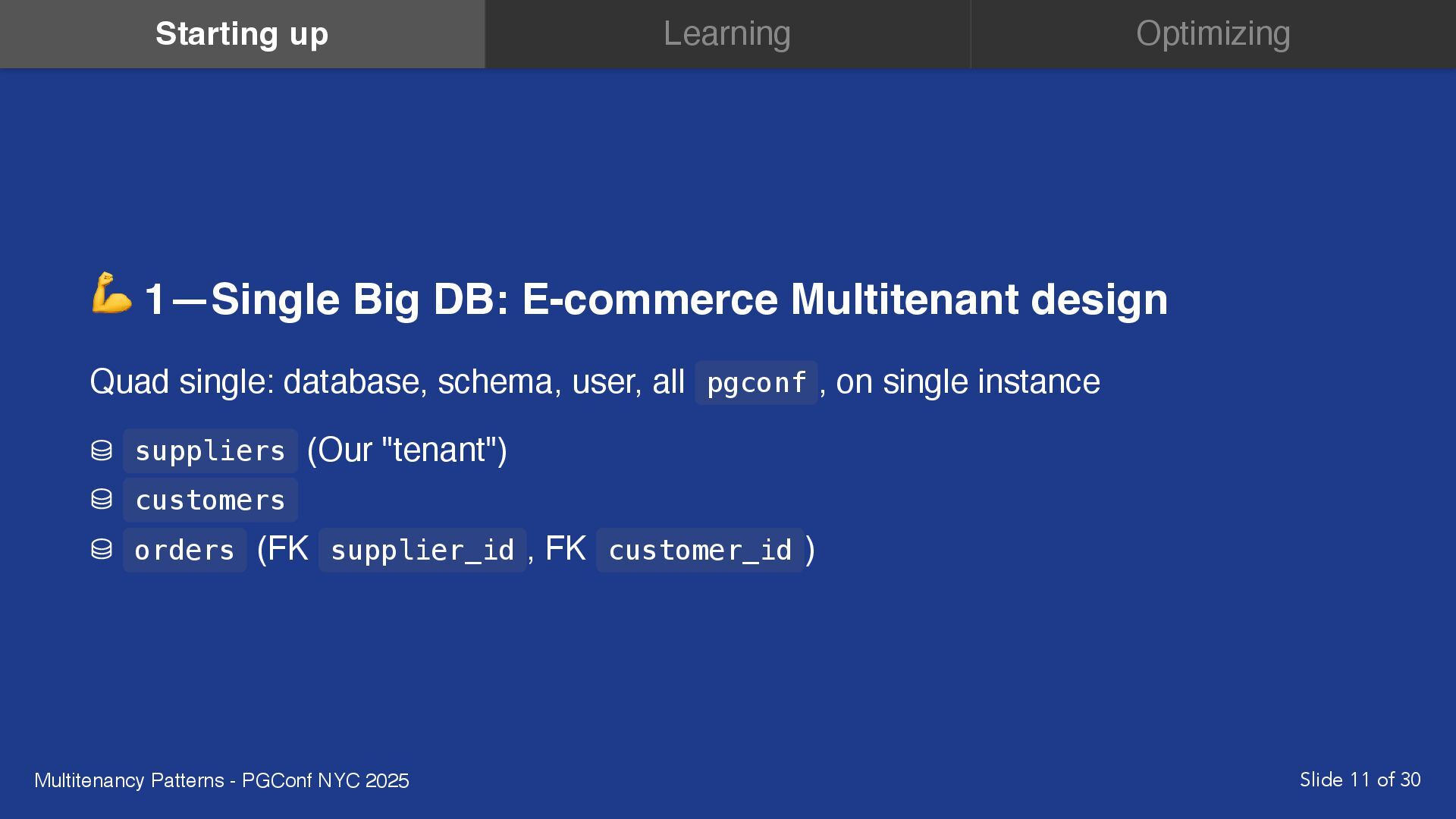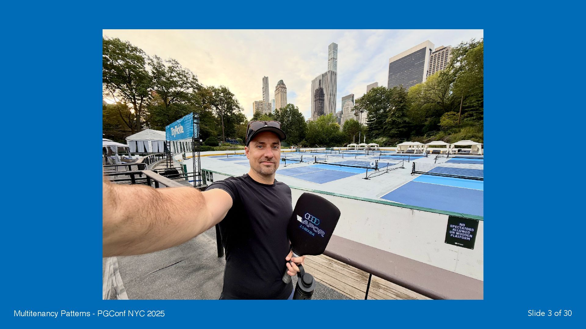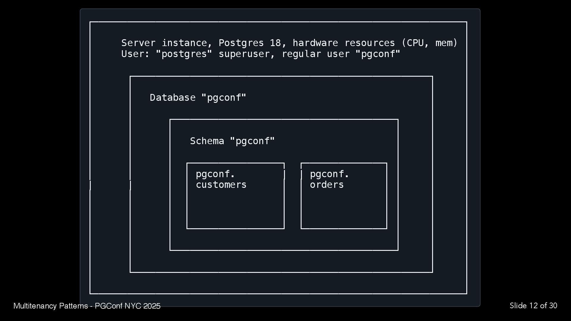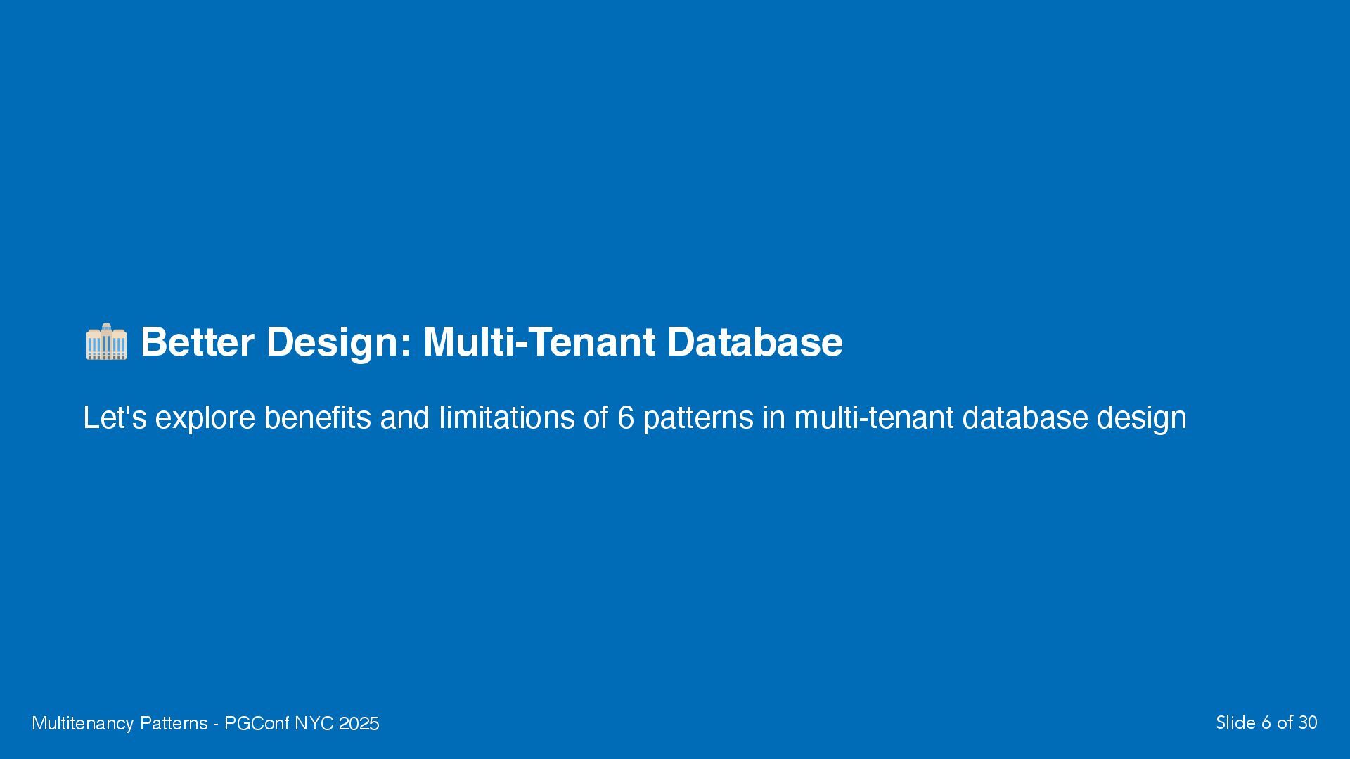 Let’s explore 6 Postgres database design patterns for an efficient and scalable multi-tenant database for use with a web application. Each pattern will be demonstrated as runnable SQL via psql on a local instance using a narrated and interactive style. Additionally, the code will be available on GitHub so that attendees can run it themselves and provide feedback. Because we’re using community Postgres and no third-party extensions, the design patterns run anywhere Postgres runs, from cloud providers to self-hosted instances.