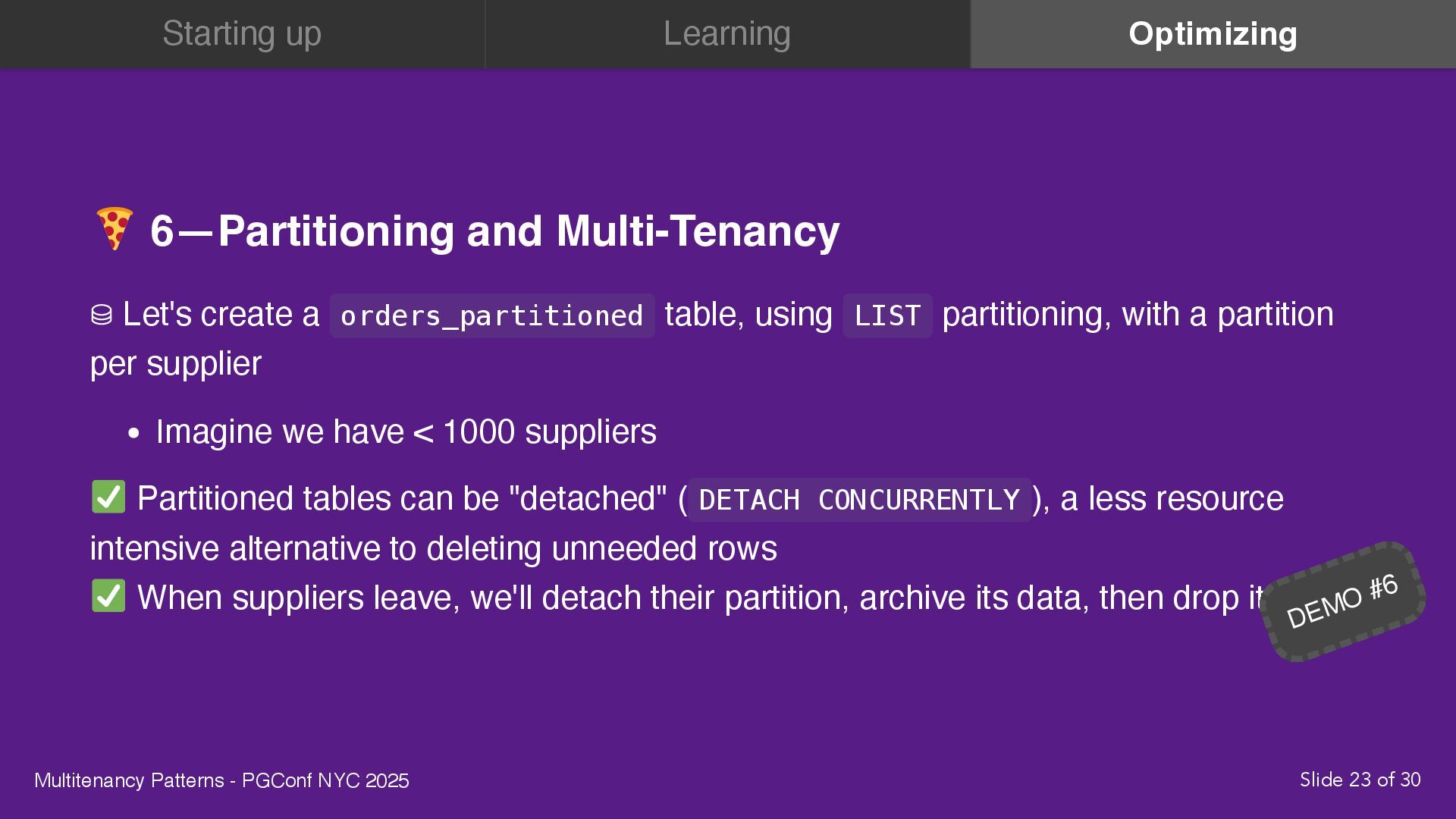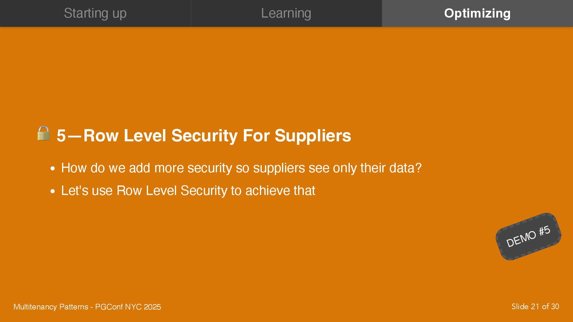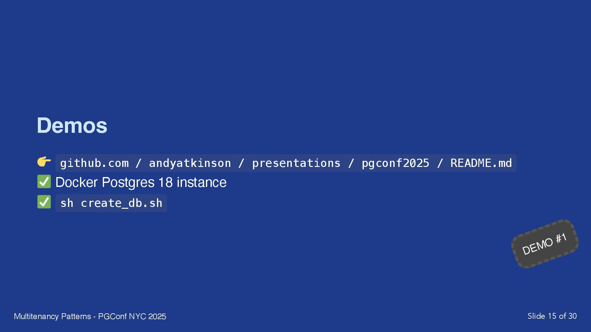 Let’s explore 6 Postgres database design patterns for an efficient and scalable multi-tenant database for use with a web application. Each pattern will be demonstrated as runnable SQL via psql on a local instance using a narrated and interactive style. Additionally, the code will be available on GitHub so that attendees can run it themselves and provide feedback. Because we’re using community Postgres and no third-party extensions, the design patterns run anywhere Postgres runs, from cloud providers to self-hosted instances.