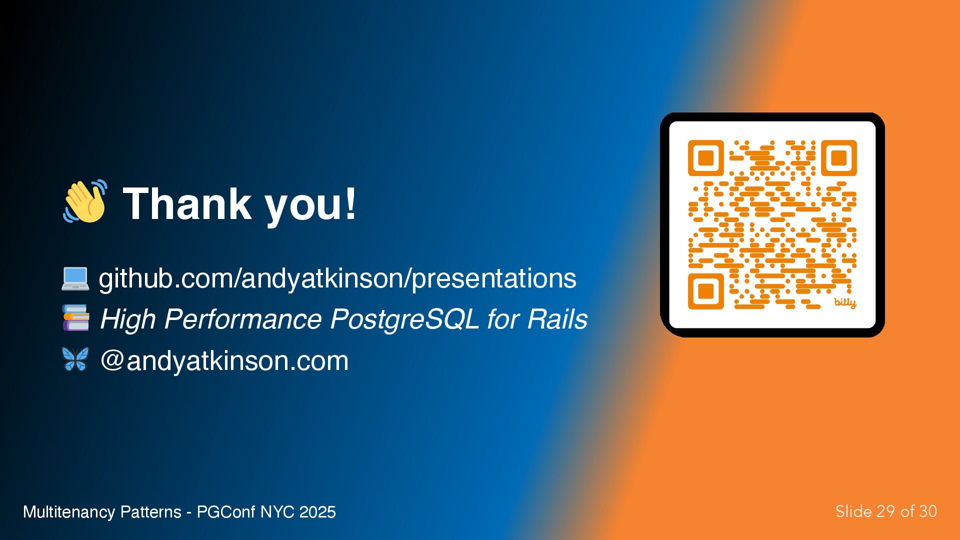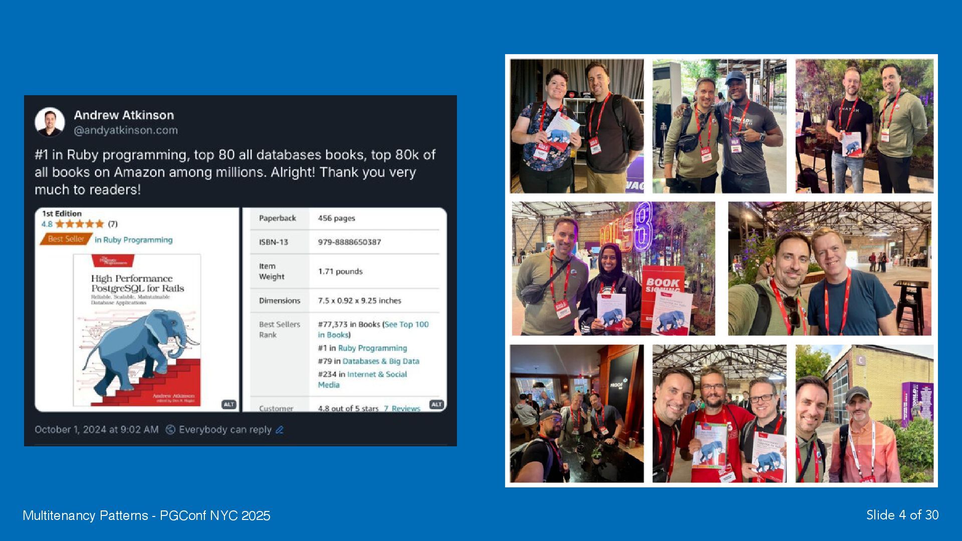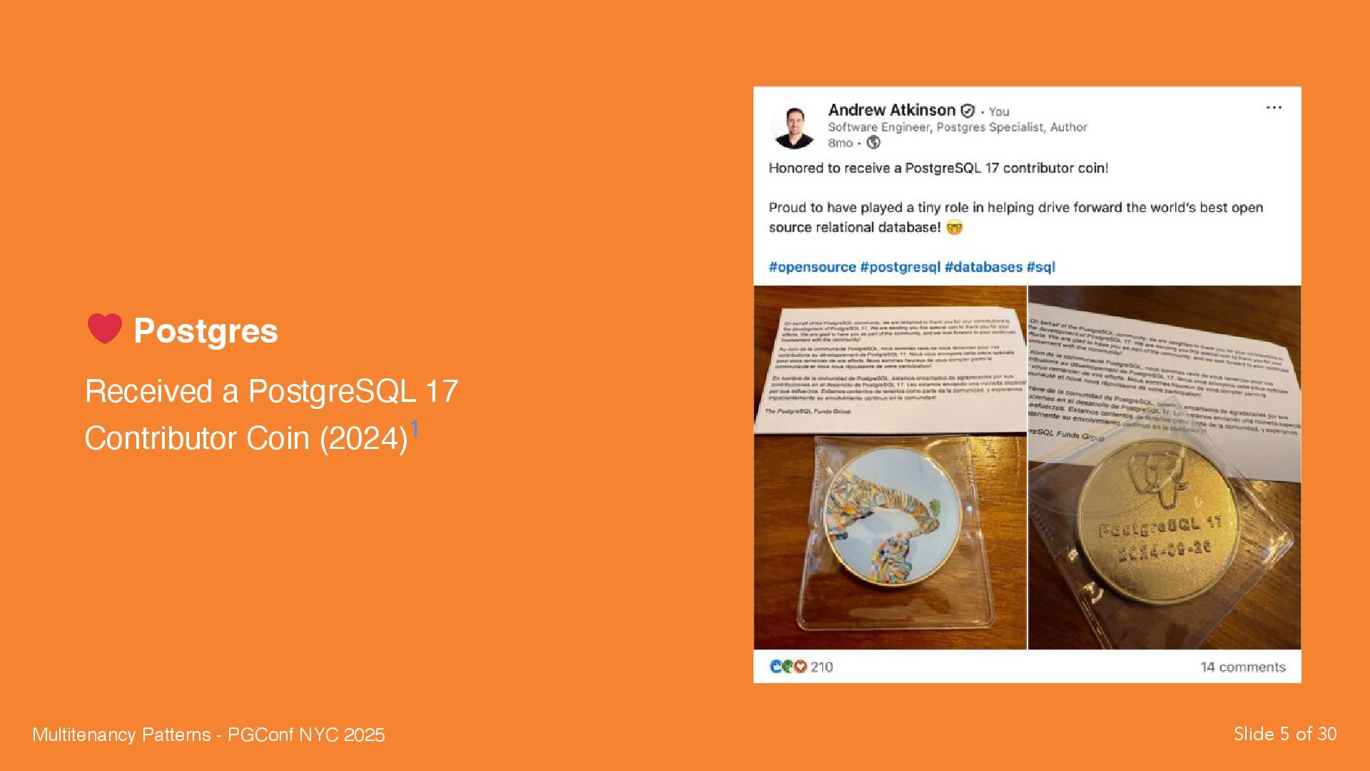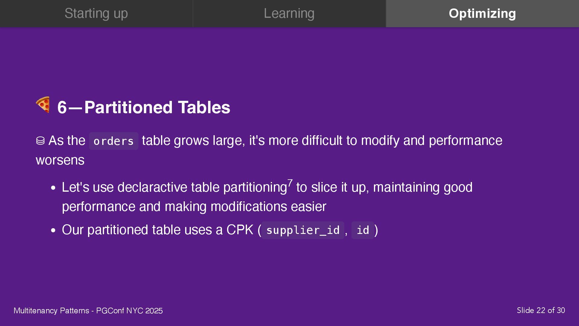 Let’s explore 6 Postgres database design patterns for an efficient and scalable multi-tenant database for use with a web application. Each pattern will be demonstrated as runnable SQL via psql on a local instance using a narrated and interactive style. Additionally, the code will be available on GitHub so that attendees can run it themselves and provide feedback. Because we’re using community Postgres and no third-party extensions, the design patterns run anywhere Postgres runs, from cloud providers to self-hosted instances.
