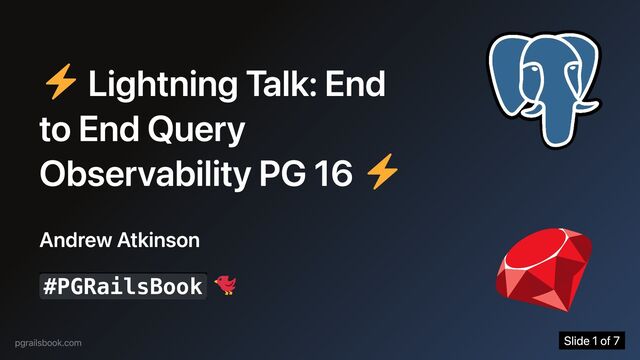 / postgres.fm Query activity in postgresql.log , pg_stat_statements , and manual and automatic query plans Generate some interesting queries in Rideshare Show queryid in exec plans w/ auto_explain in PG 16 pgrailsbook.com Slide 5 of 7