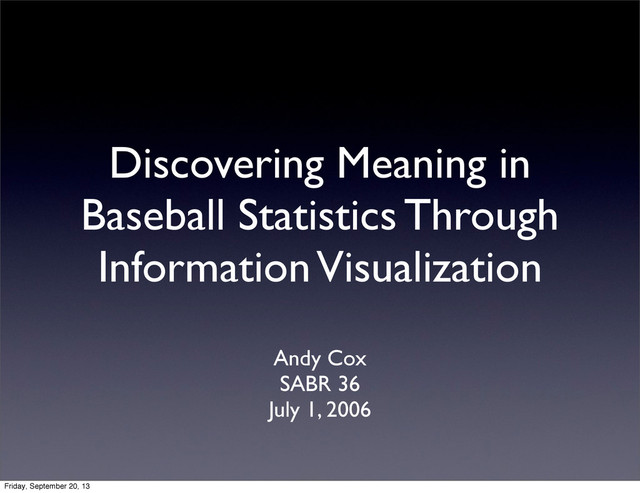 We humans are visual creatures. Thus, any tool that might improve our capacity to understand large datasets through visual display of information patterns deserves our attention. After defining and describing infovis (“information visualization”) systems and their principles, Andy Cox presents applications he has developed, using Retrosheet data and other large-scale datasets, to demonstrate the utility of infovis for rapid summarizing, analyzing, filtering, and understanding baseball data and their interrelationships.