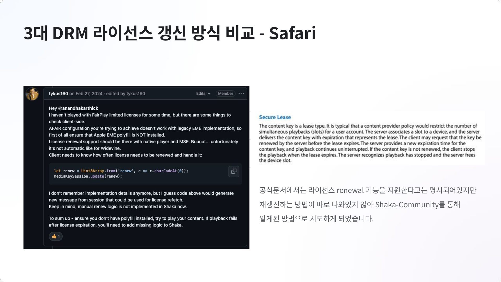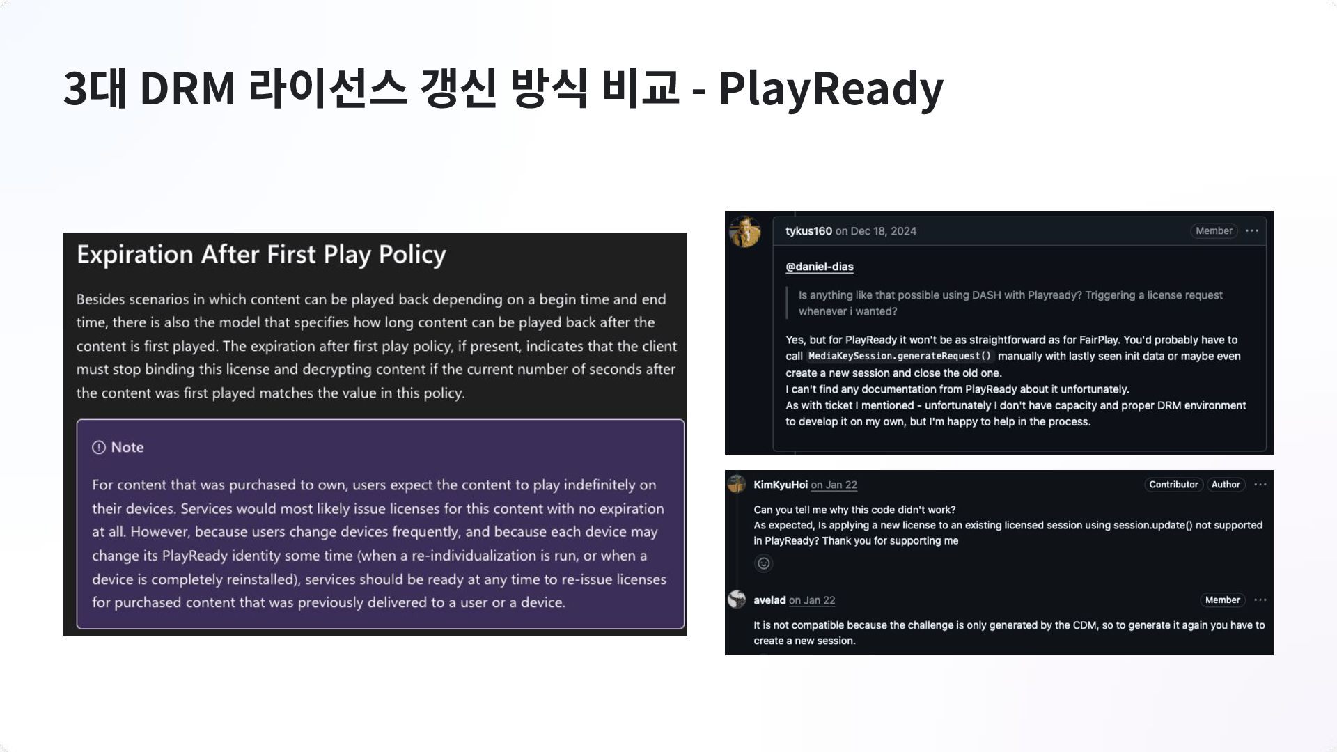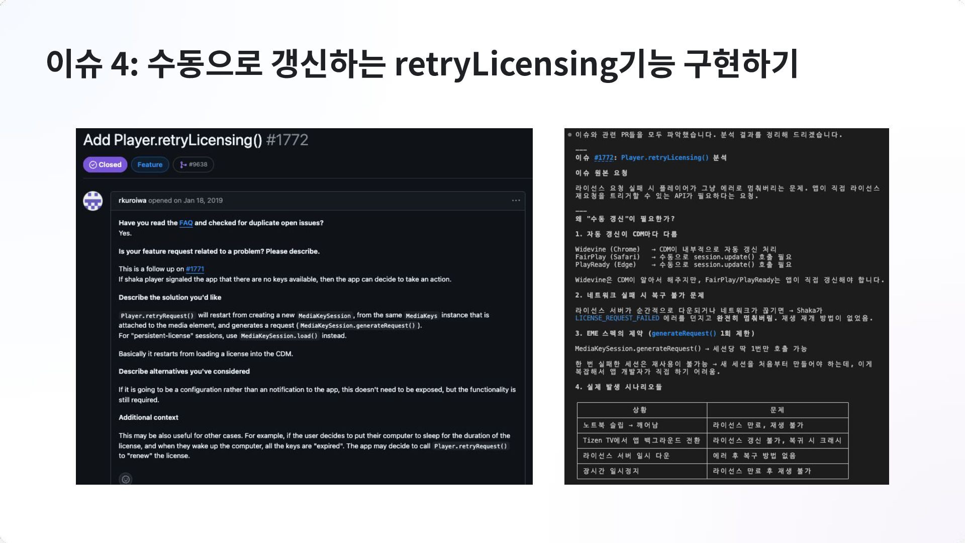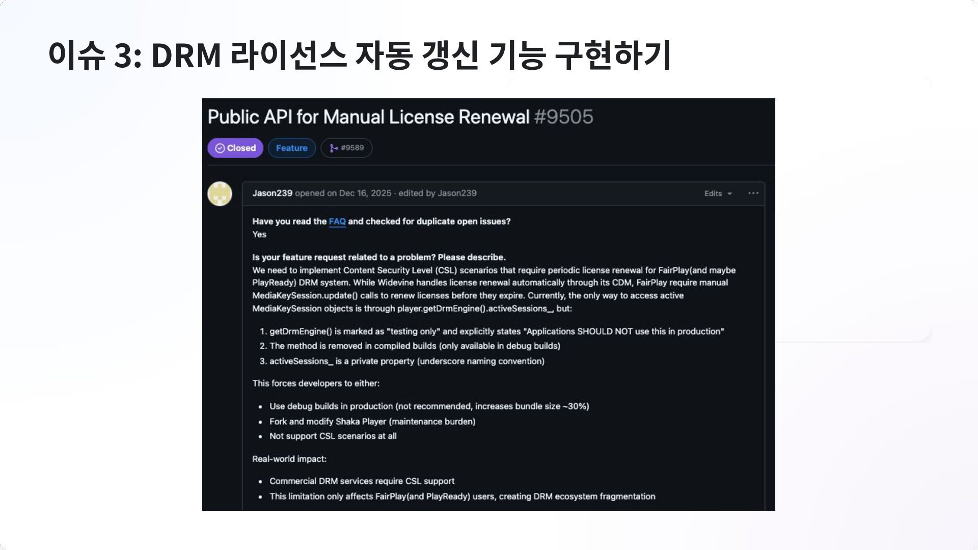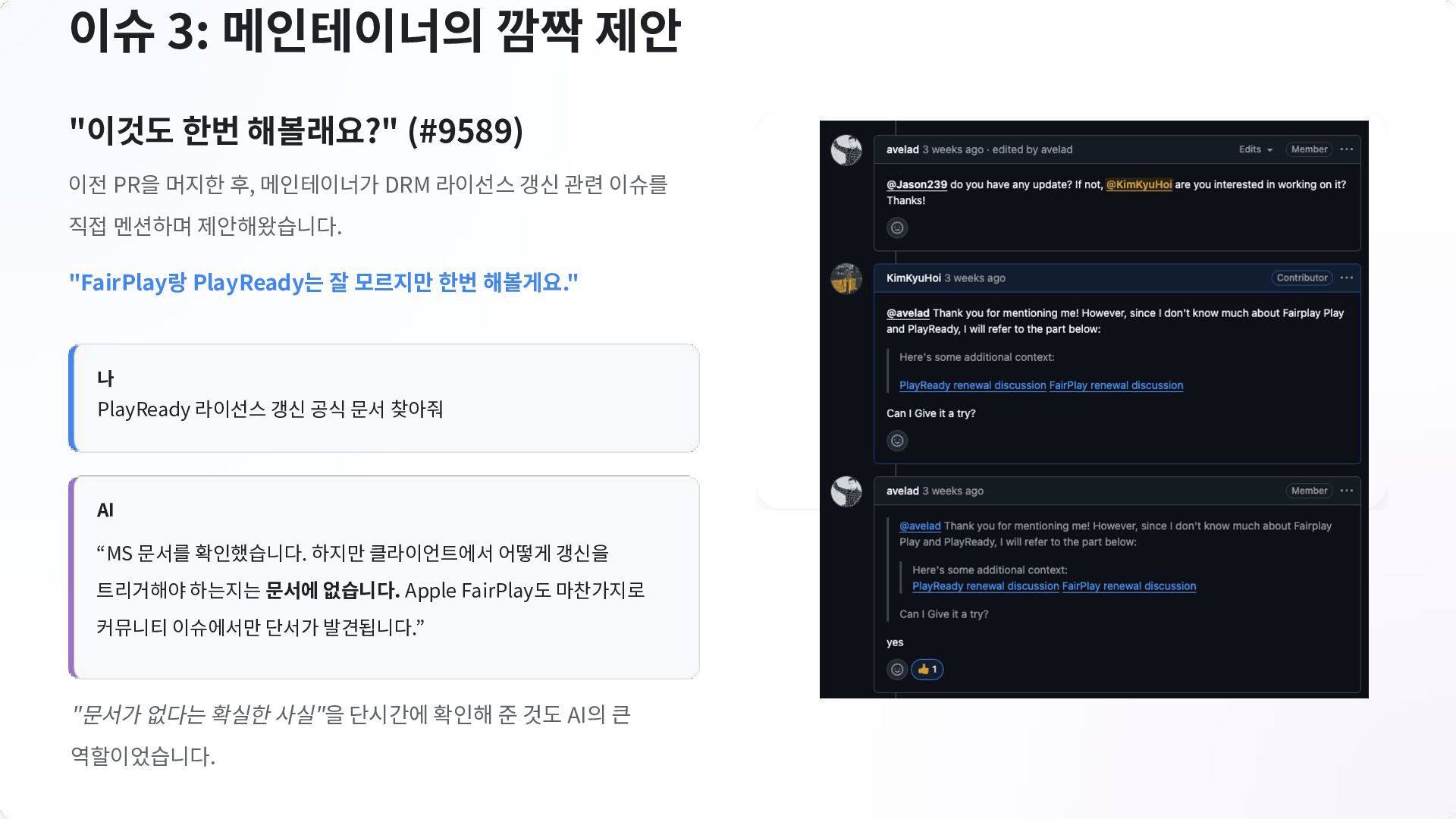 라이선스 갱신 관련 이슈를 직접 멘션하며 제안해왔습니다. "FairPlay랑 PlayReady는 잘 모르지만 한번 해볼게요." "문서가 없다는 확실한 사실"을 단시간에 확인해 준 것도 AI의 큰 역할이었습니다. 나 PlayReady 라이선스 갱신 공식 문서 찾아줘 AI “MS 문서를 확인했습니다. 하지만 클라이언트에서 어떻게 갱신을 트리거해야 하는지는 문서에 없습니다. Apple FairPlay도 마찬가지로 커뮤니티 이슈에서만 단서가 발견됩니다.” 이슈 3: 메인테이너의 깜짝 제안