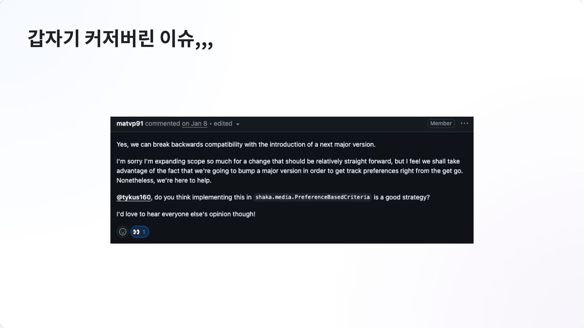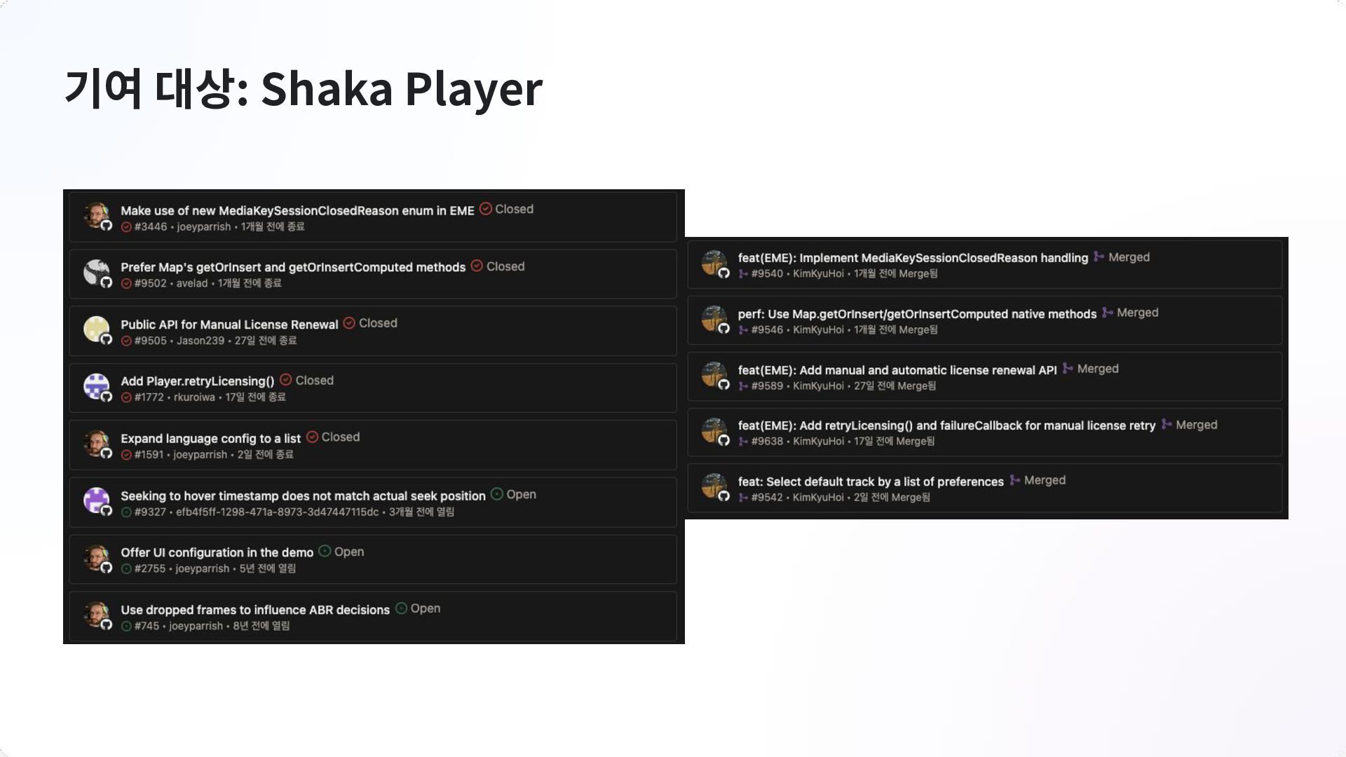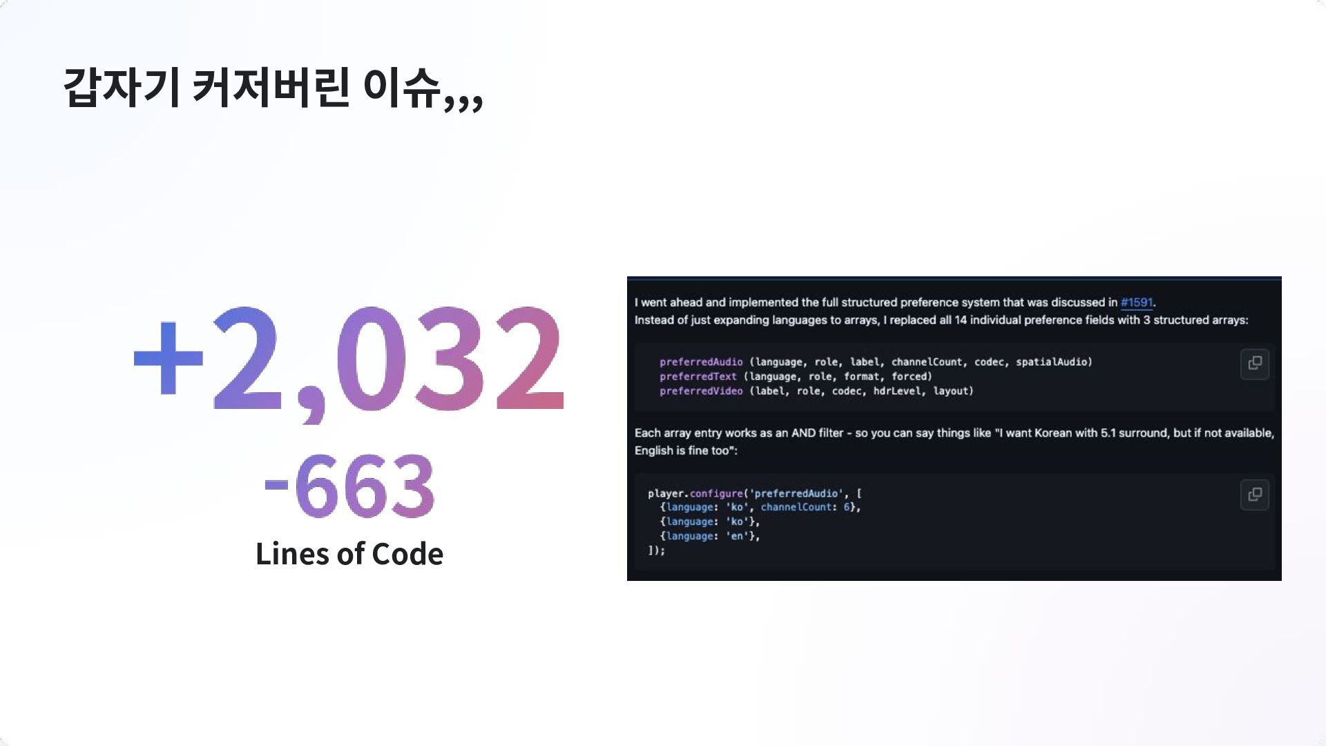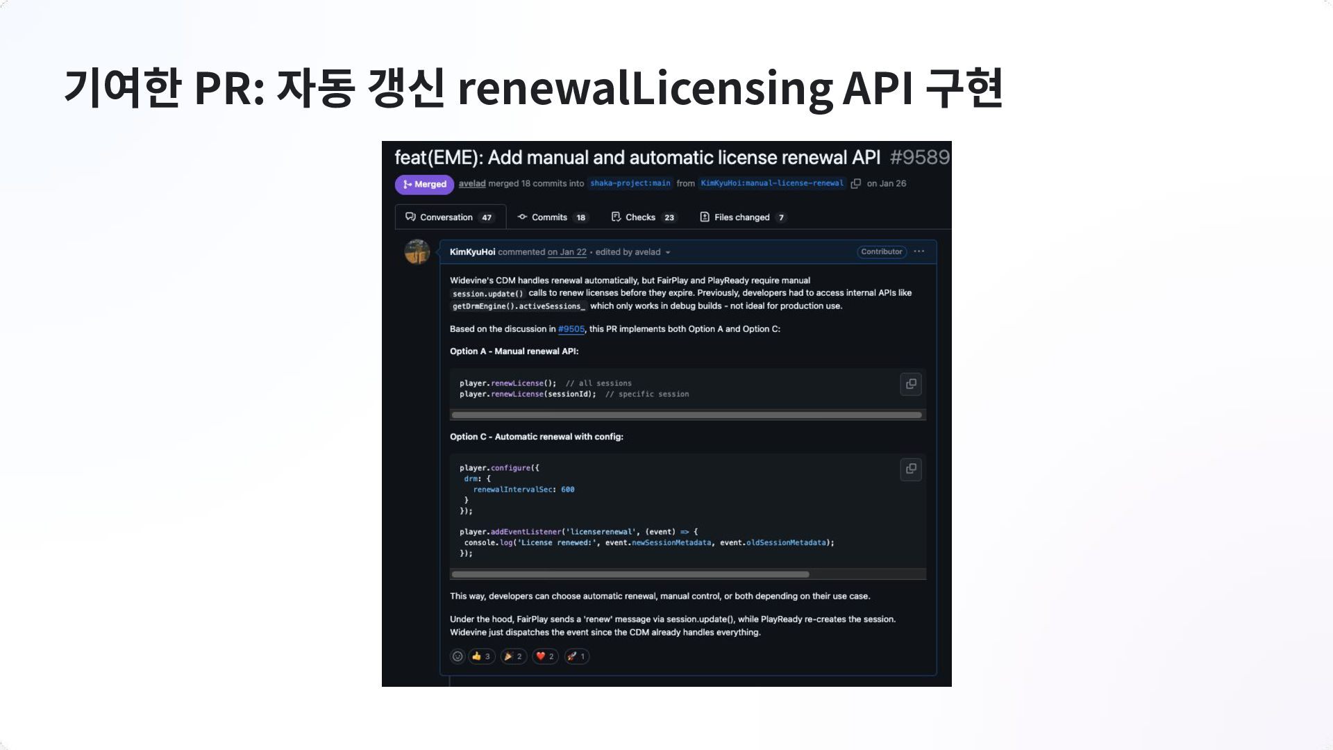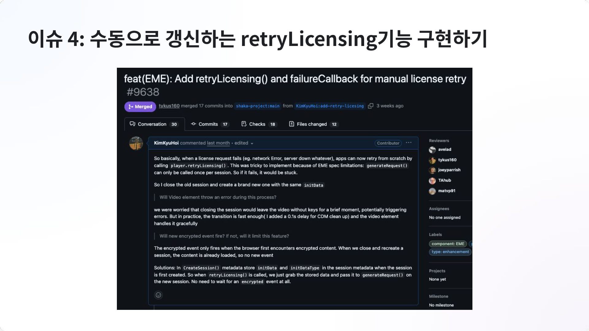 라이선스 갱신 관련 이슈를 직접 멘션하며 제안해왔습니다. "FairPlay랑 PlayReady는 잘 모르지만 한번 해볼게요." "문서가 없다는 확실한 사실"을 단시간에 확인해 준 것도 AI의 큰 역할이었습니다. 나 PlayReady 라이선스 갱신 공식 문서 찾아줘 AI “MS 문서를 확인했습니다. 하지만 클라이언트에서 어떻게 갱신을 트리거해야 하는지는 문서에 없습니다. Apple FairPlay도 마찬가지로 커뮤니티 이슈에서만 단서가 발견됩니다.” 이슈 3: 메인테이너의 깜짝 제안