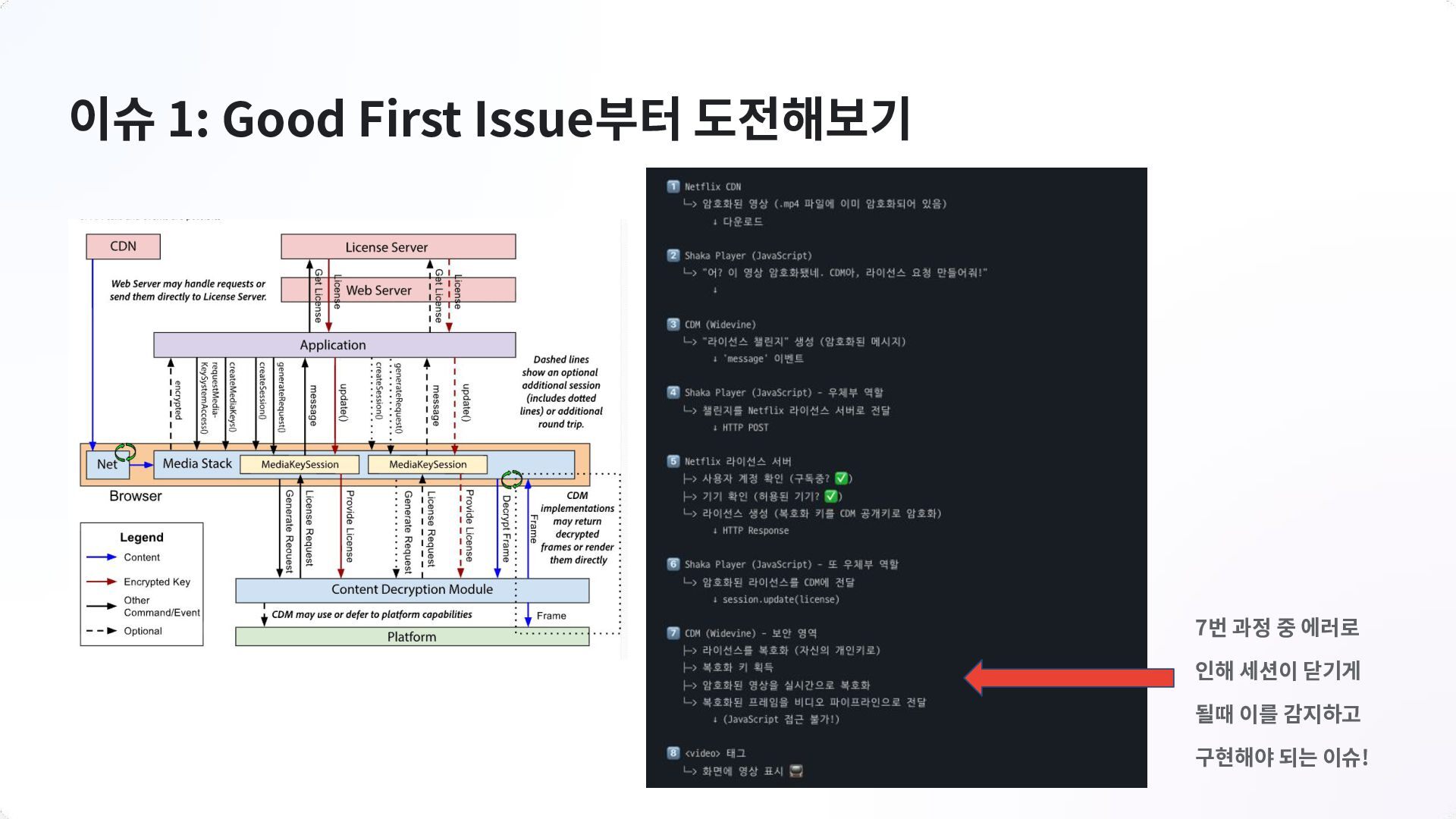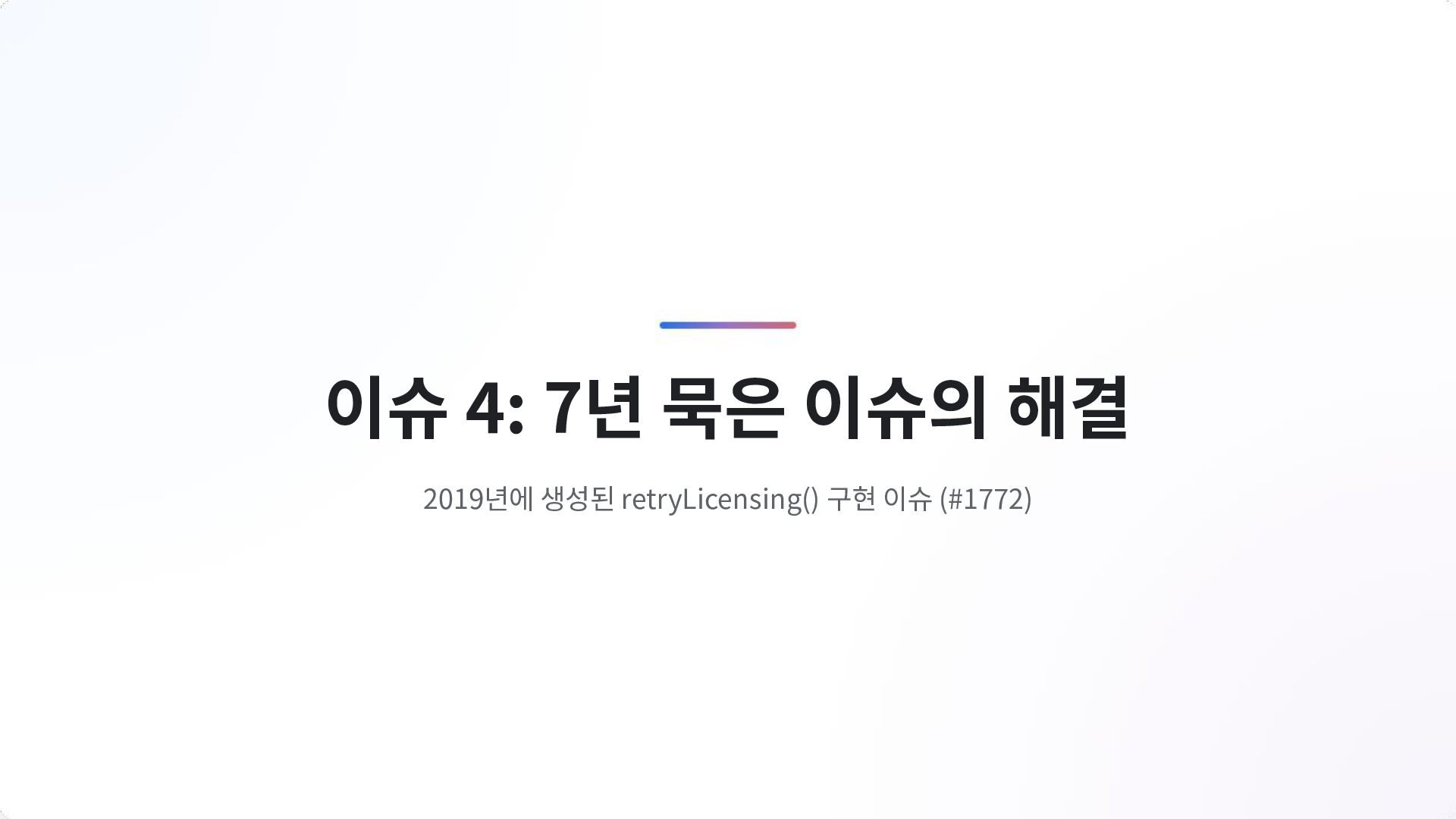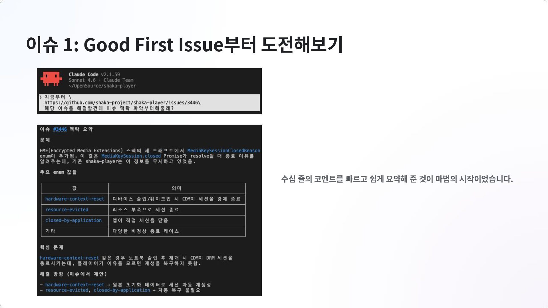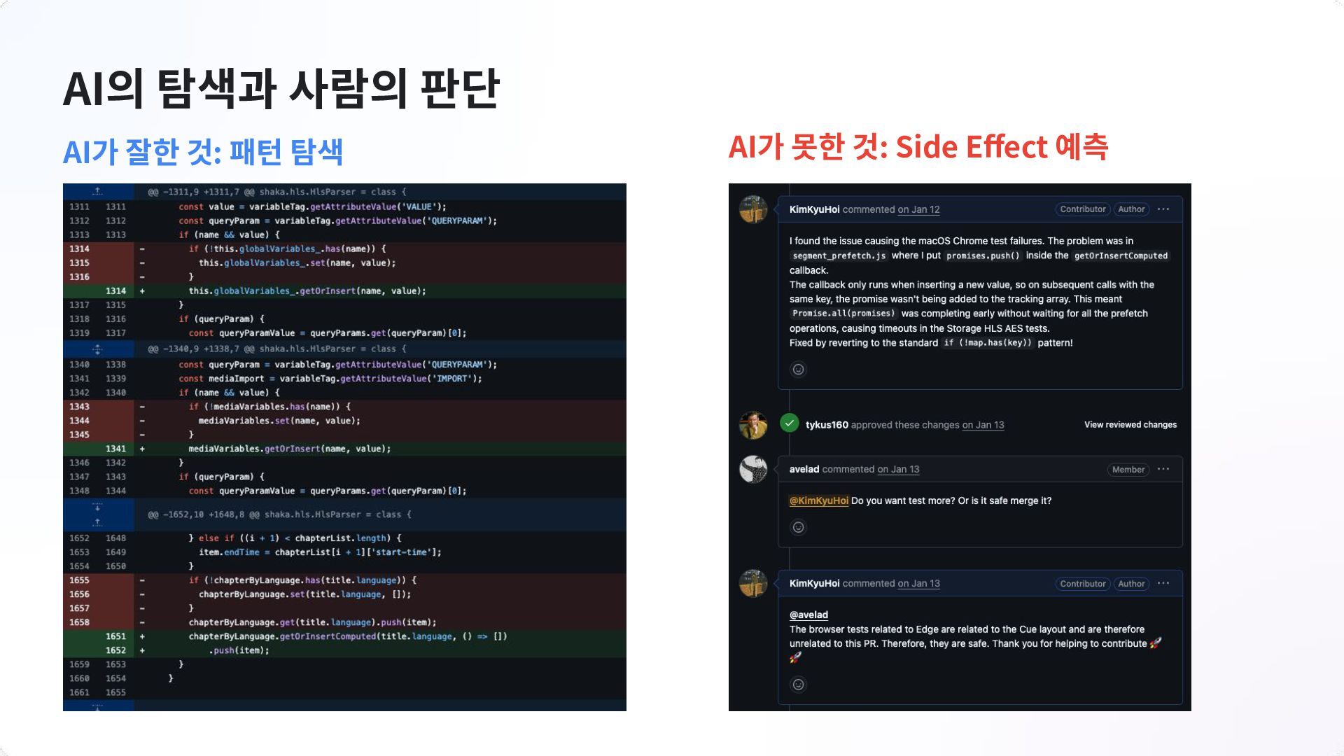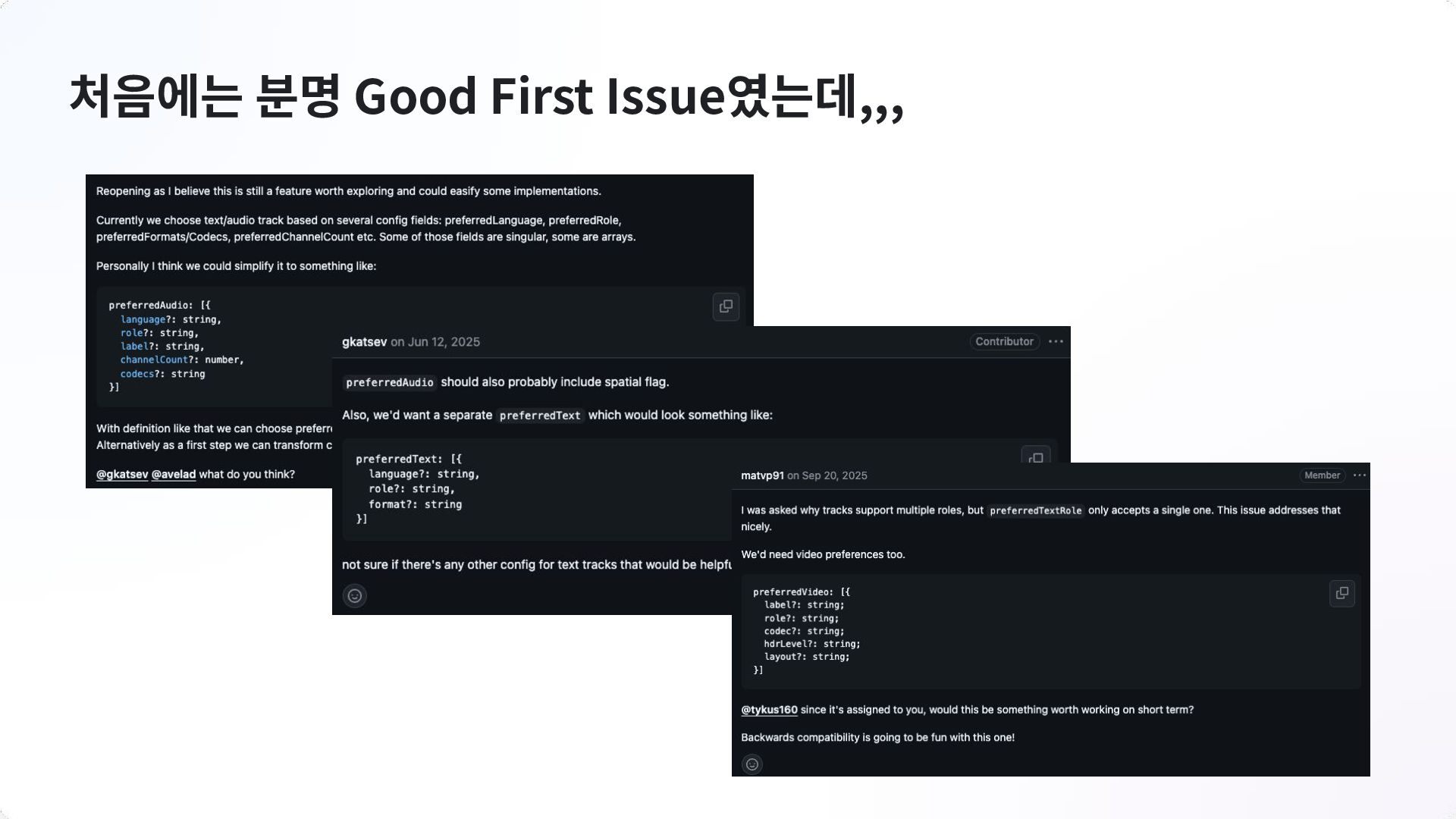 라이선스 갱신 관련 이슈를 직접 멘션하며 제안해왔습니다. "FairPlay랑 PlayReady는 잘 모르지만 한번 해볼게요." "문서가 없다는 확실한 사실"을 단시간에 확인해 준 것도 AI의 큰 역할이었습니다. 나 PlayReady 라이선스 갱신 공식 문서 찾아줘 AI “MS 문서를 확인했습니다. 하지만 클라이언트에서 어떻게 갱신을 트리거해야 하는지는 문서에 없습니다. Apple FairPlay도 마찬가지로 커뮤니티 이슈에서만 단서가 발견됩니다.” 이슈 3: 메인테이너의 깜짝 제안
