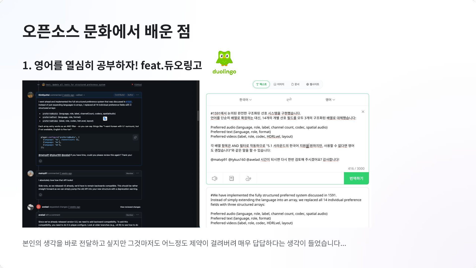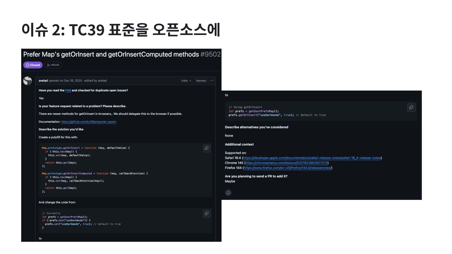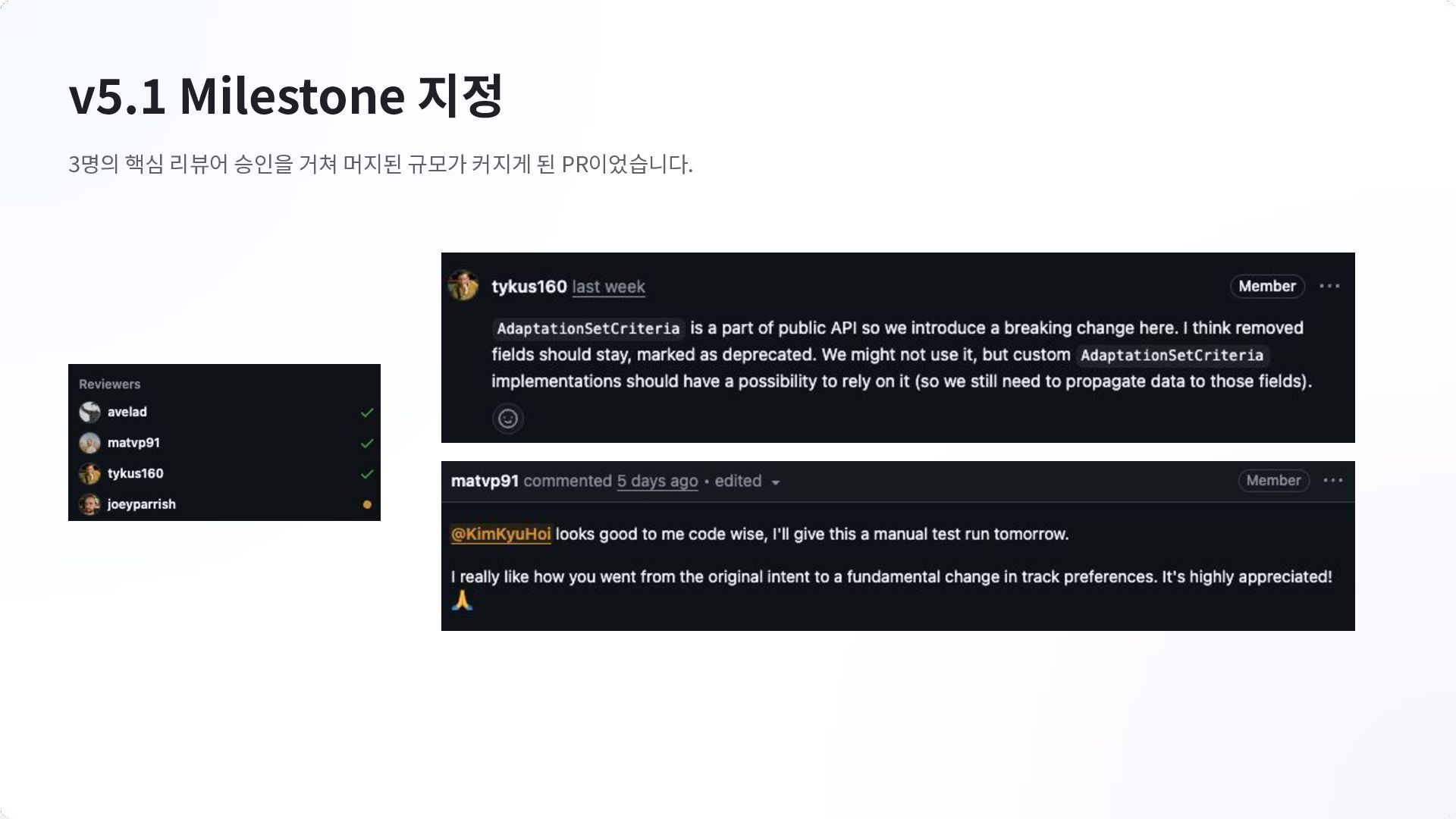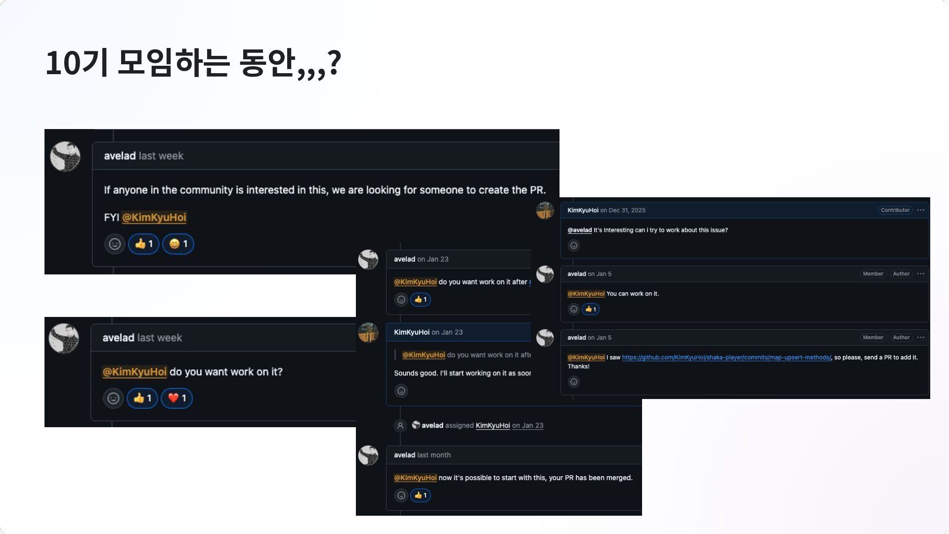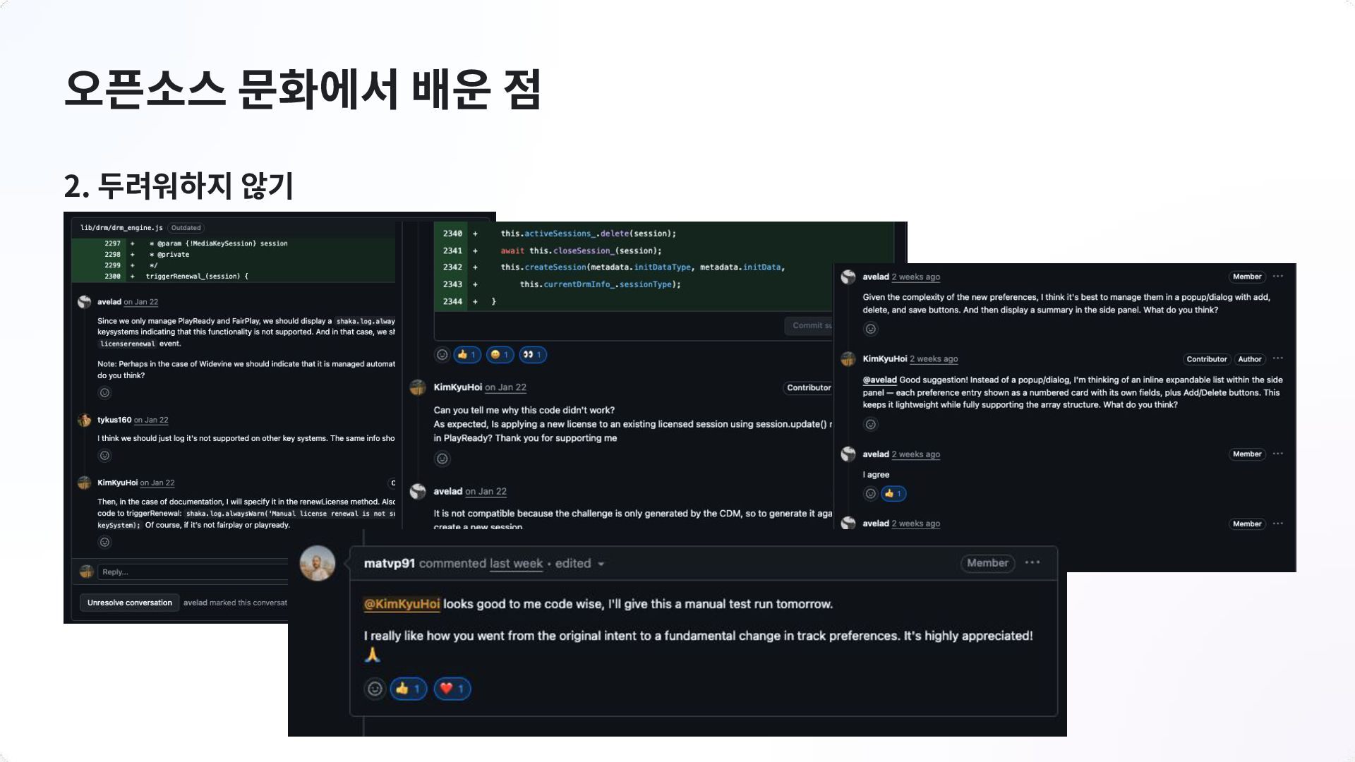 라이선스 갱신 관련 이슈를 직접 멘션하며 제안해왔습니다. "FairPlay랑 PlayReady는 잘 모르지만 한번 해볼게요." "문서가 없다는 확실한 사실"을 단시간에 확인해 준 것도 AI의 큰 역할이었습니다. 나 PlayReady 라이선스 갱신 공식 문서 찾아줘 AI “MS 문서를 확인했습니다. 하지만 클라이언트에서 어떻게 갱신을 트리거해야 하는지는 문서에 없습니다. Apple FairPlay도 마찬가지로 커뮤니티 이슈에서만 단서가 발견됩니다.” 이슈 3: 메인테이너의 깜짝 제안