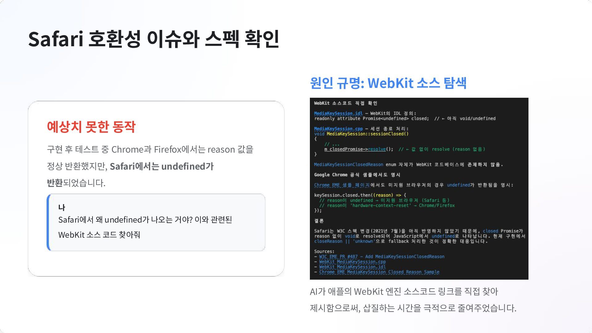 값을 정상 반환했지만, Safari에서는 undefined가 반환되었습니다. 원인 규명: WebKit 소스 탐색 AI가 애플의 WebKit 엔진 소스코드 링크를 직접 찾아 제시함으로써, 삽질하는 시간을 극적으로 줄여주었습니다. 나 Safari에서 왜 undefined가 나오는 거야? 이와 관련된 WebKit 소스 코드 찾아줘 Safari 호환성 이슈와 스펙 확인